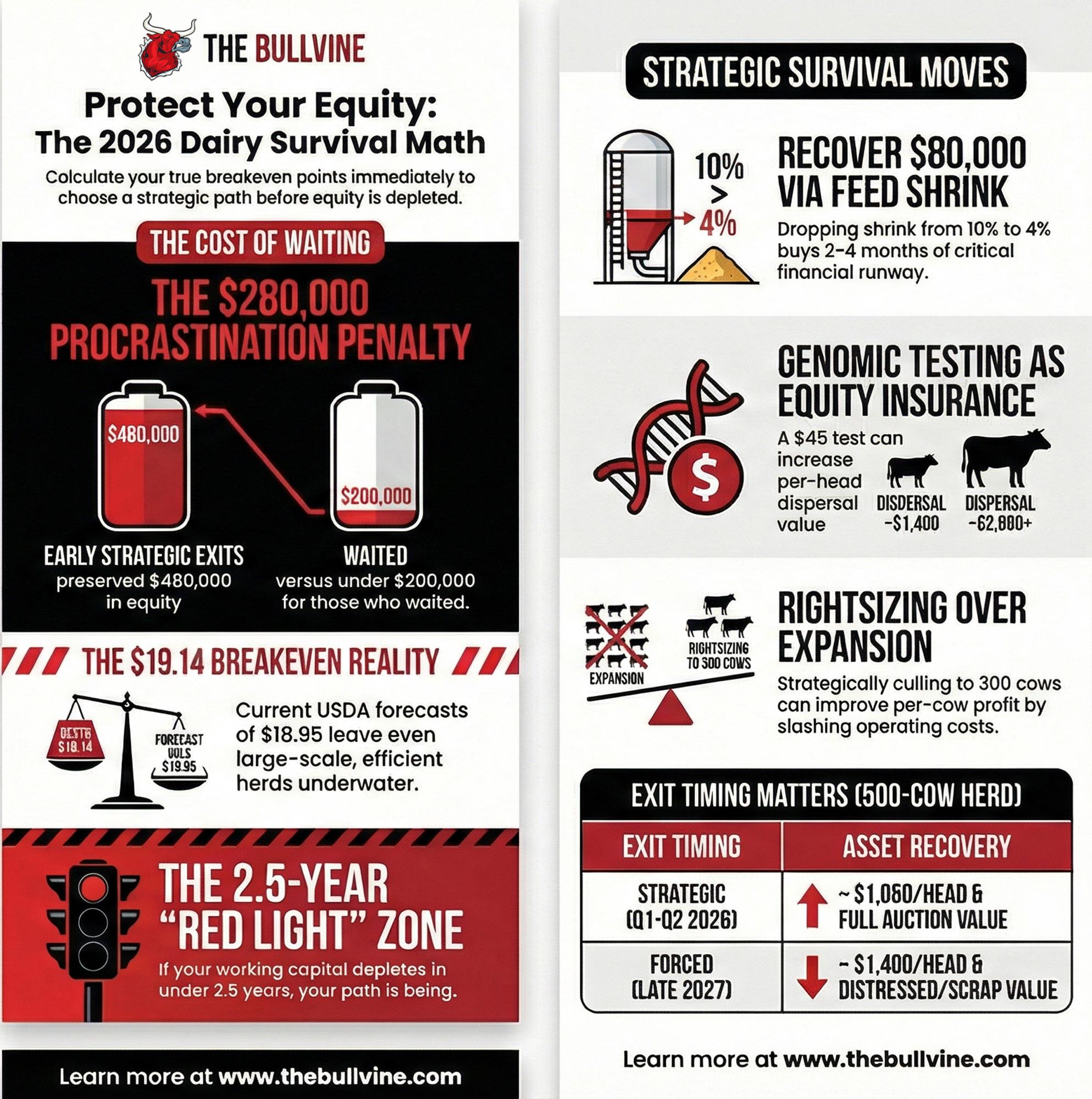 - Decision timing determines equity preservation. The gap between a Q1 strategic exit and a late-2027 forced liquidation can exceed $200,000 in a representative 500-cow scenario. Verified genetics pushes the strategic number toward the top of the range.