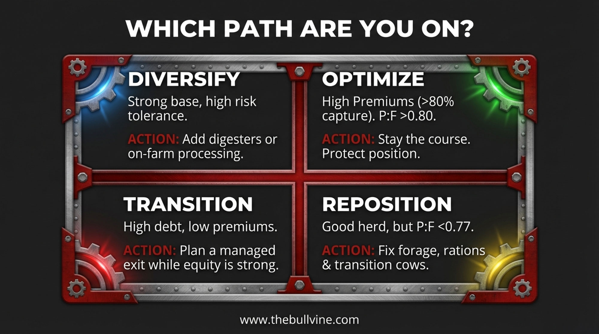 | 🚀 Diversify | – Already “optimize” on base milk – Scale and risk tolerance for new revenue – Willing to trade simplicity for margin | You add digesters, renewable gas, or modest on-farm processing after base milk is competitive | New revenue streams, environmental story, margin stacking—but requires capital, management bandwidth, market execution | Higher risk, higher reward.Don’t diversify fromweakness. |
