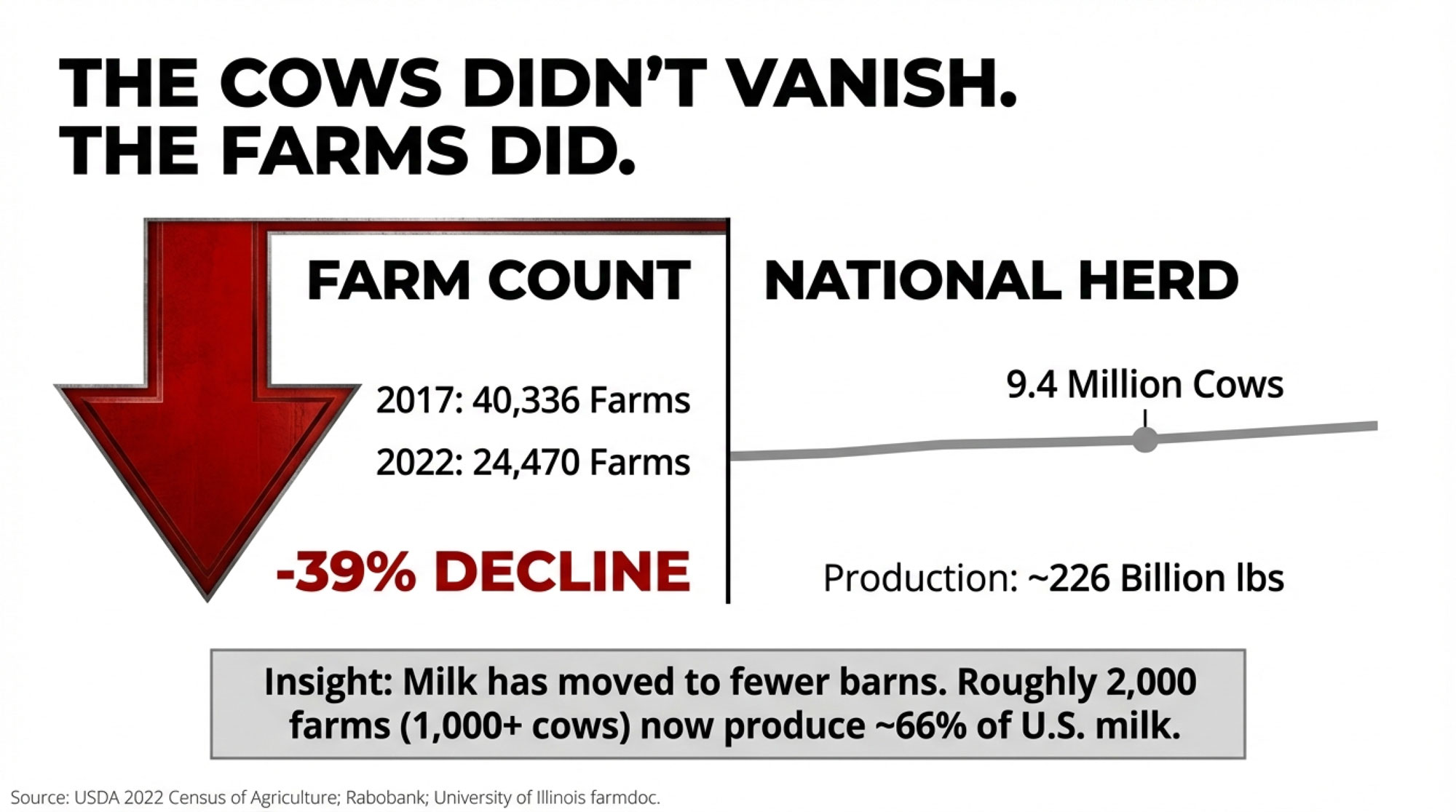 39% of U.S. dairies gone in 5 years. Milk production? Still up. The survivors picked a lane. Have you?