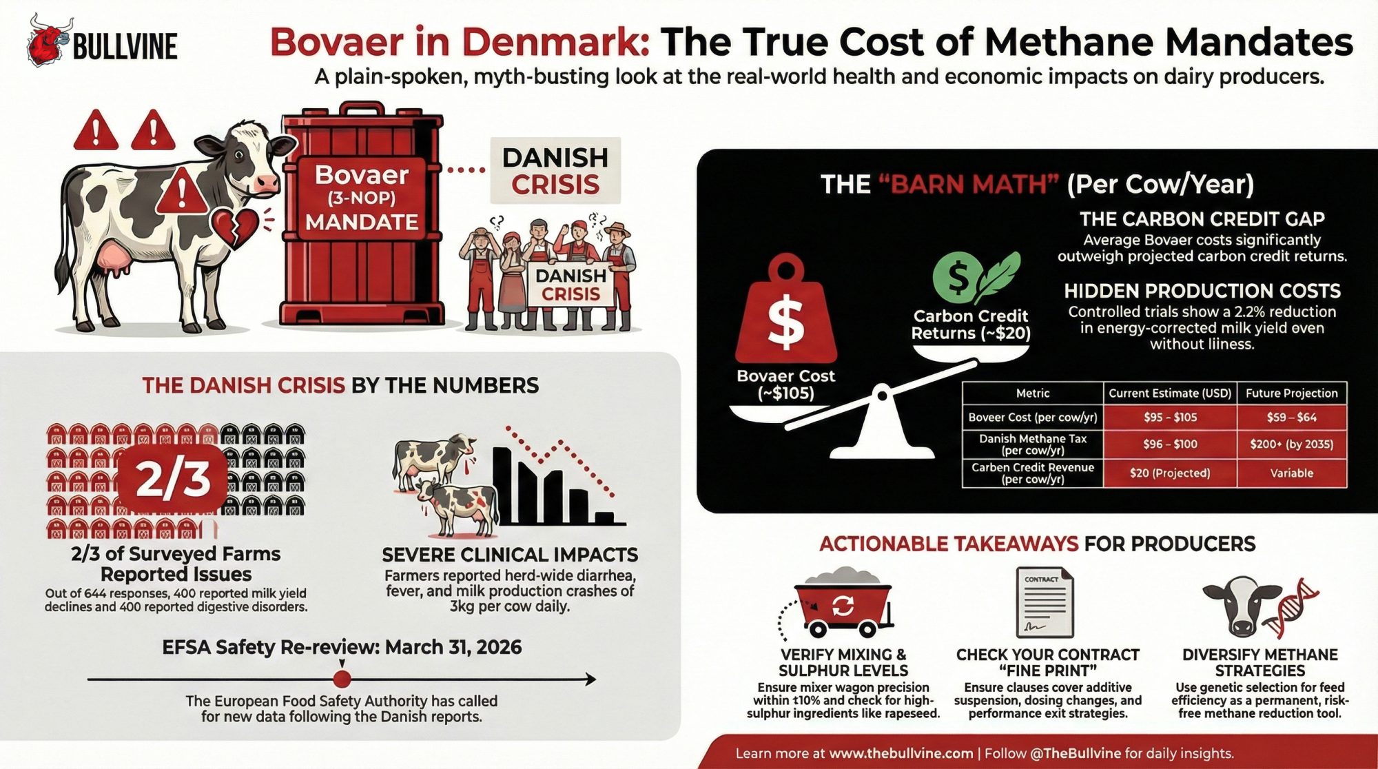 Executive Summary: Denmark told 1,600 dairy farms to feed Bovaer or face fines. Most started in October 2025. By November, SEGES Innovation surveys showed two-thirds of responding farms reporting crashed milk yields, reduced intake, and digestive disorders — diarrhea, fever, and cows that couldn’t stand. Norway and Sweden didn’t wait: both countries paused Bovaer trials entirely. Now the European Commission has ordered EFSA to reassess safety, with a data deadline of March 31, 2026. The question isn’t whether Bovaer is dangerous — it’s whether Denmark’s mandate pushed adoption faster than any protocol could handle, and what that means for North American farms that are now being offered the same additive in methane contracts. Inside: the barn math, four hypotheses nobody else is separating, and the three contract clauses to read before you sign.