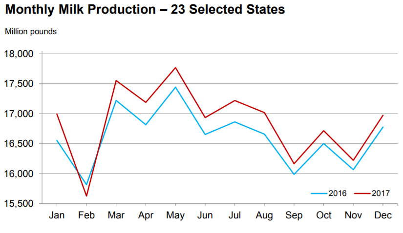 Milk production in the 23 major States during December totaled 17.0 billion pounds, up 1.2 percent from December 2016. November revised production at 16.2 billion pounds, was up 1.0 percent from November 2016. The November revision represented a decrease of 24 million pounds or 0.1 percent from last month’s preliminary production estimate.