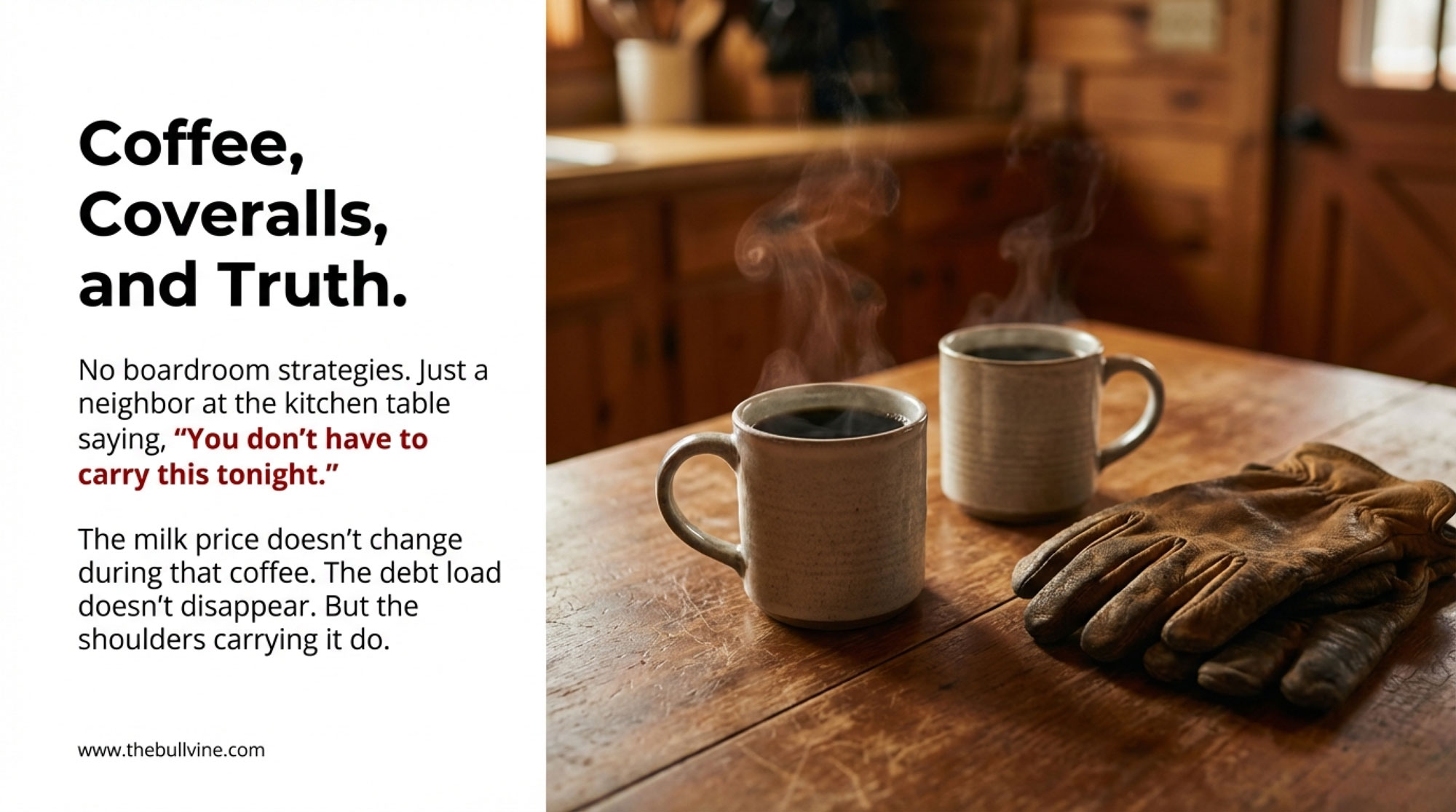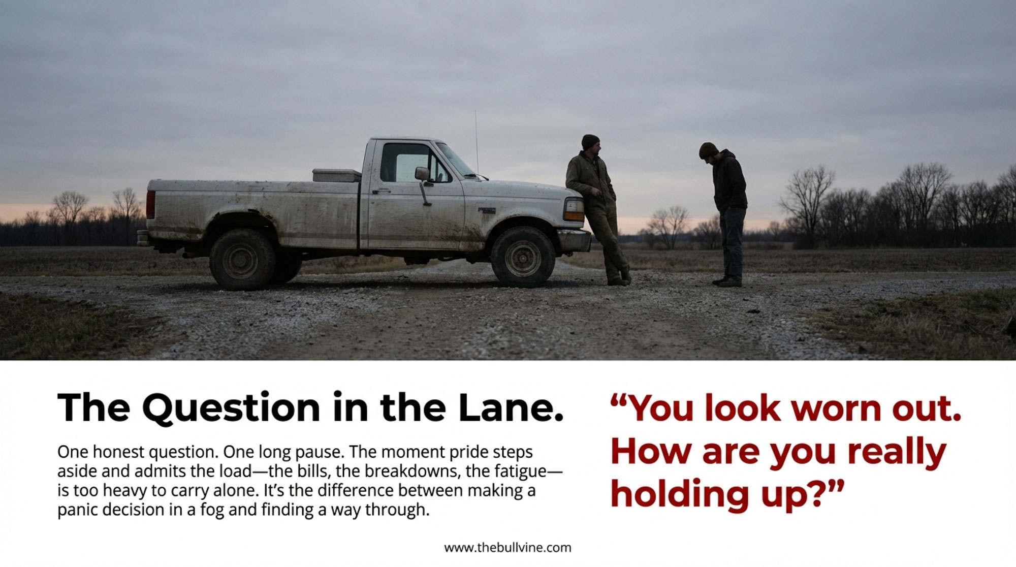 In the lane, beside the bulk tank, or at the back of the sale barn, a simple “How are you really holding up?” can open more doors than you’d expect. Ask it once, then leave enough silence for a real answer to land. - Offer one concrete piece of help.