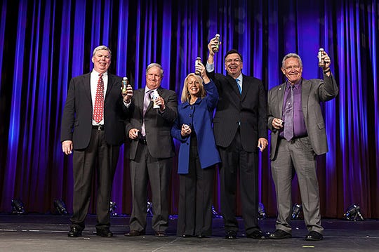 Thomas Gallagher, second from right, of Dairy Management Inc., is shown at a 2014 event announcing more than $500 million in partnerships with seven major companies. (Photo: Farm Journal)