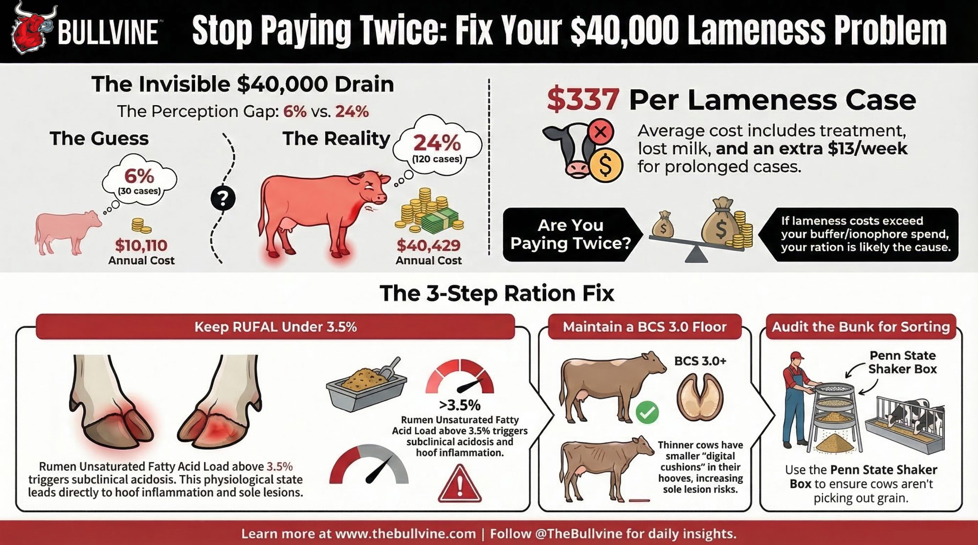 Executive Summary: Many freestall herds guess lameness at 5–7%, but proper scoring often lands closer to 20–25%, turning “normal” into a roughly $40,000‑a‑year problem at about $337 per case. Using the Robcis 2023 cost model and recent lameness research, this article walks through a composite 500‑cow herd in which one RUFAL audit traced that hidden bill back to the ration rather than just the trim chute. A high RUFAL (over about 3.5% of DM) quietly drives more subclinical acidosis, thinner digital cushions, and extra claw horn lesions — especially when low‑BCS dry cows and TMR sorting pile on. By pulling RUFAL down, enforcing a BCS 3.0 floor at calving, and tightening sorting with the Penn State shaker box, that herd cut lameness from 24 to under 18 cases per 100 cows and avoided roughly $10,000 a year in lameness cost. The 30‑Day Lameness Audit and “Paying Twice” Calculator give you a simple way to put your buffer bill, lameness bill, and ration risk on one page. If your own math shows lameness costs bigger than your buffer spend, it’s a strong signal your ration and dry‑cow program — not your hoof trimmer — are the first place to go to work.
