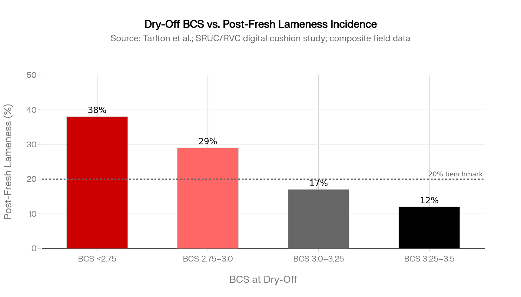 - Don’t calve cows under BCS 3.0; thin cows bring softer digital cushions into the riskiest weeks and show up more often with claw horn lesions.