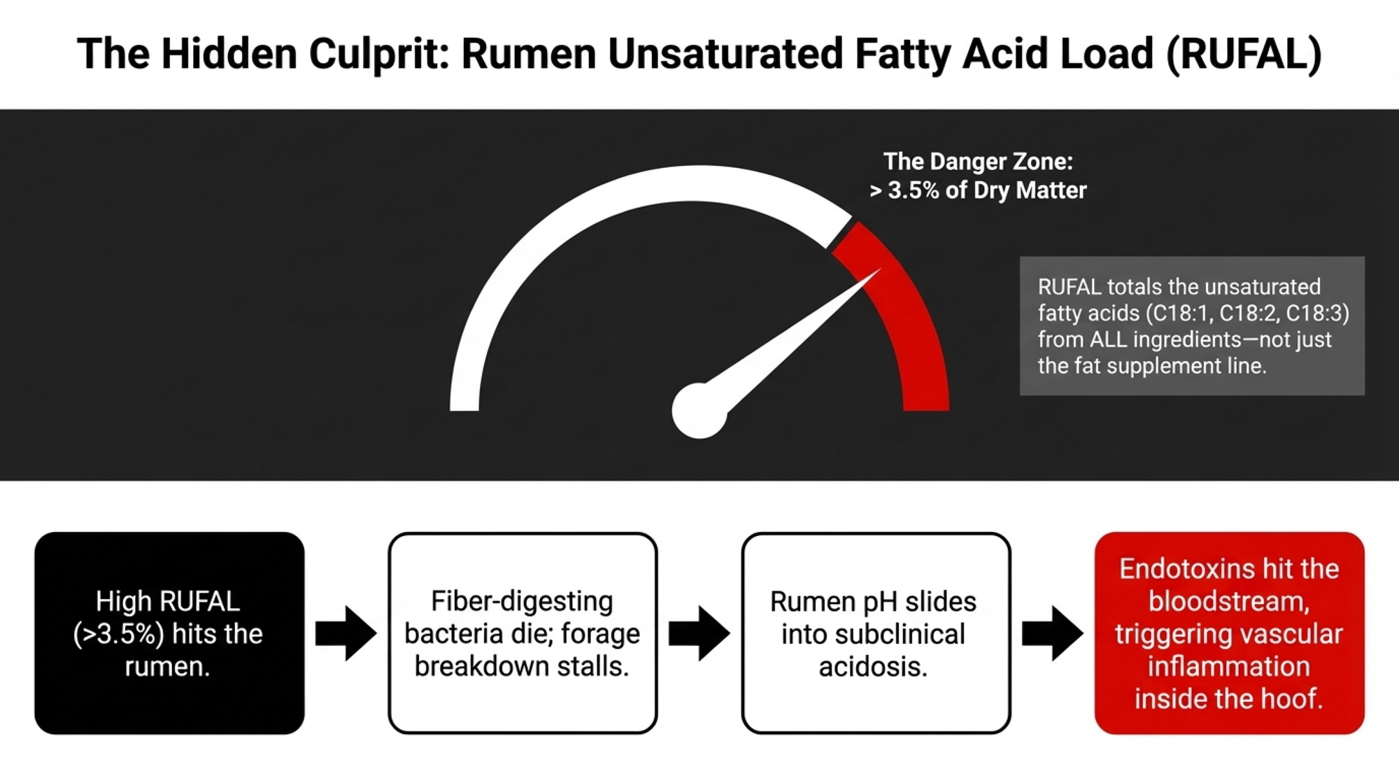 RUFAL — Rumen Unsaturated Fatty Acid Load — totals the unsaturated C18:1, C18:2, and C18:3 fatty acids entering the rumen from all ingredients: corn silage, high-moisture corn, DDGS, whole or extruded soybeans, vegetable oils — not just the “fat supplement” line. Dr. Tom Jenkins at Clemson University developed the concept. On this herd, the number came back at about 3.8% of the ration DM.