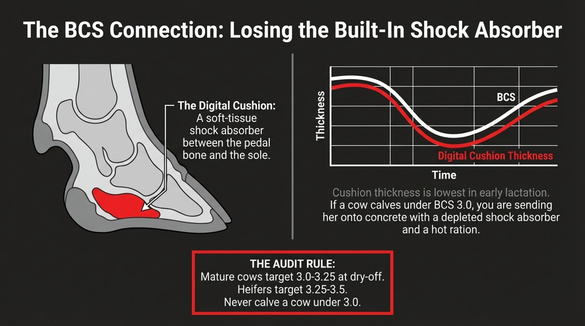 If you send a cow into that calving period at BCS 2.5, you’re not just flirting with ketosis. You’re thinning the shock absorber between bone and sole when she’s about to spend more time on concrete and eat a hotter ration. For a deeper look at how prepartum BCS affects DMI and energy balance, The Bullvine’s breakdown of the University of Florida BCS research lays out the numbers by BCS category.