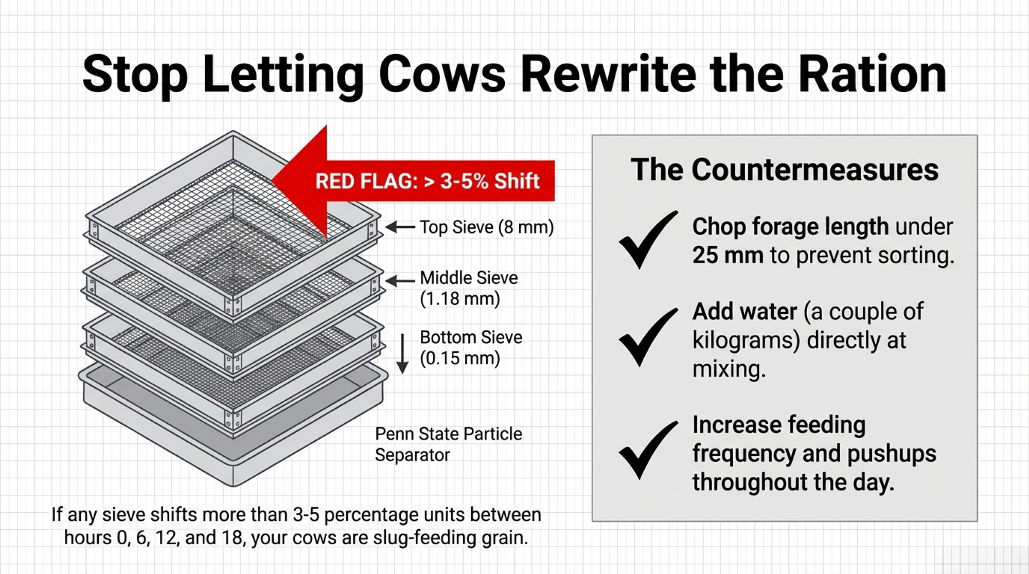 Running the Penn State particle separator at 0, 6, 12, and 18 hours told the real story. Penn State Extension guidelines flag a change of more than about 3–5 percentage units in any sieve over several hours as meaningful sorting. By 12 hours post-feeding, this herd’s top screen had swung past that. Cows were picking out grain and fines early and leaving a stemmy mess for the last shift.