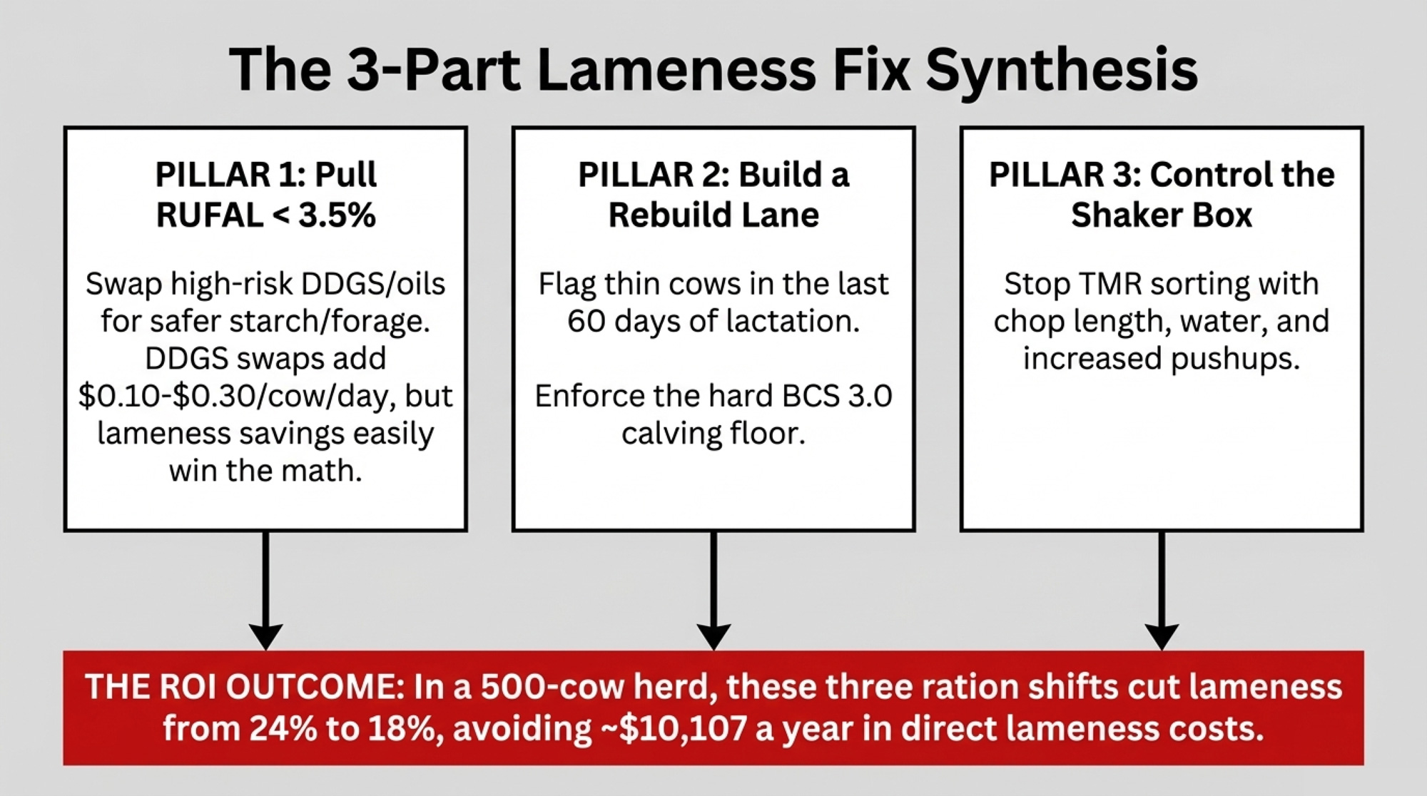 Bringing RUFAL under 3.5% and enforcing a BCS floor of about 3.0 at calving are two of the cheapest moves you can make to change your lameness math — even before you touch the barn. Pulling RUFAL down may cost you on the ingredient line, especially if DDGS is your cheapest energy source. But if your lameness savings outrun that extra $0.10–0.30 per cow per day in feed cost, the math is still in your favor.