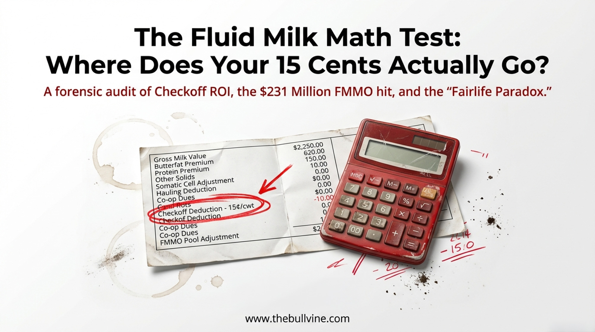 Executive Summary: U.S. dairy producers pay 15¢/cwt into the national checkoff. Texas A&M’s independent model says it adds about $1/cwt to the all‑milk price — but 76% of the $6 billion in cumulative value is tied to cheese exports and foodservice. In comparison, fluid milk innovation gets just $121.5 million and a $1.68 return per dollar. For a 275‑cow herd like Mike Yager’s in Wisconsin, that modelled uplift looks good on paper, yet the June 2025 FMMO reform yanked $231.9 million from producer pools in three months, with his Upper Midwest order losing $64 million to higher make allowances and gaining only $7 million back in differentials. The brief 2024 uptick in fluid sales was driven by higher‑priced whole, organic, and value‑added products, but it flipped negative again in 2025, so this is not a structural demand comeback for conventional Class I milk. At the same time, Coca‑Cola’s fairlife has grown into a $7 billion ultra‑filtered milk brand, showing how checkoff‑supported category growth can create huge value that mostly lands on corporate balance sheets rather than your milk statement. This analysis uses barn‑math walk‑throughs and four practical levers — boosting components, using beef‑on‑dairy strategically, reassessing your processor’s product mix, and tracking school milk and FMMO policy shifts — so you can see how much checkoff ROI actually hits your own fluid milk check and where you still have room to move.
