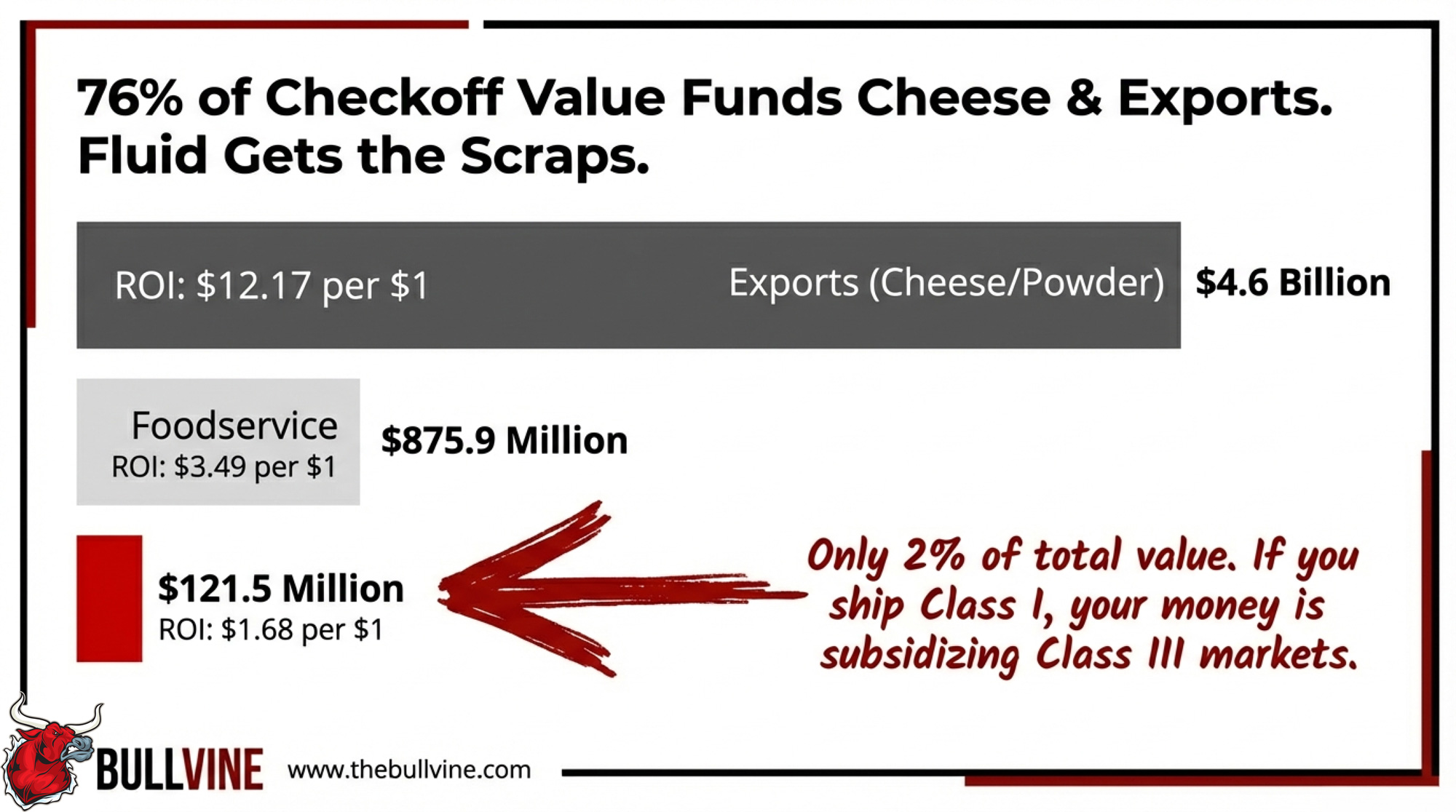 - An independent Texas A&M analysis verifies the checkoff’s $6 billion. But 76% is exports and foodservice — overwhelmingly cheese demand that lifts Class III. Fluid milk innovation returned $1.68 per dollar over six years. If your revenue depends on Class I, you’re funding a system that works better for someone else’s milk. The data exists for you to measure that gap.
