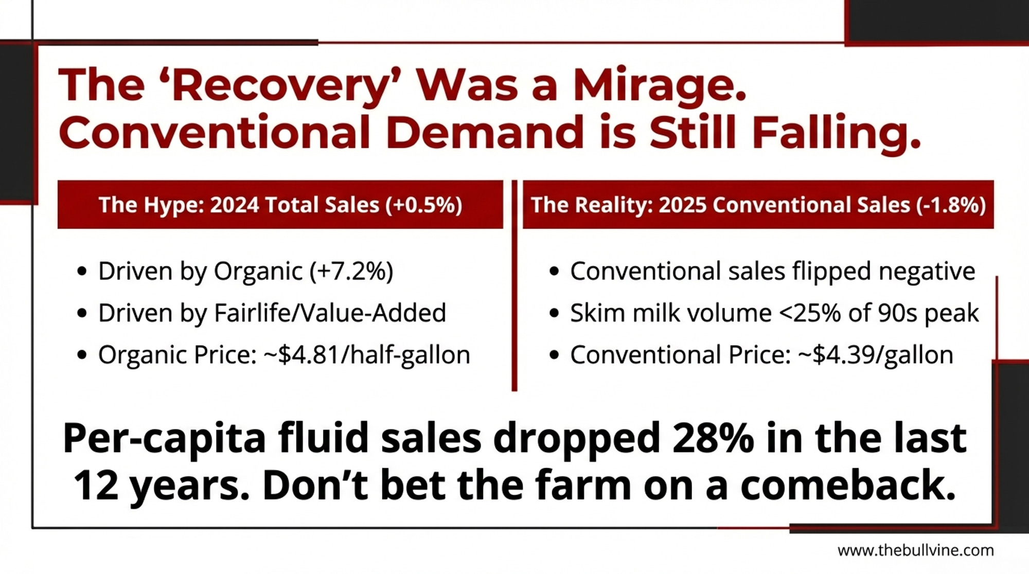 She was right. By February 2025, USDA AMS monthly data showed total sales down 2.2%, year-to-date down 1.3%. First-half 2025: down 0.5% on a leap-day-adjusted basis, totaling 21.1 billion pounds. November 2025: total fluid down 1.8%, conventional down 1.5%, organic down 6.0% (USDA AMS, January 2026).