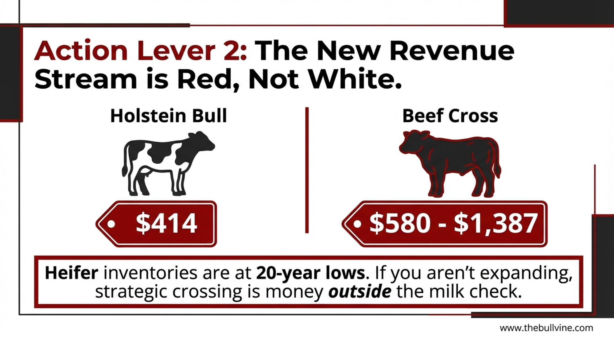 - Component optimization can add $14,525–$24,400/year for a 200-cow herd that moves 0.2 points of test. Beef-on-dairy crosses are clearing $580–$1,387 per calf at February 2026 auctions. Neither requires waiting on Washington or your checkoff board. You’ve got levers. Use them.