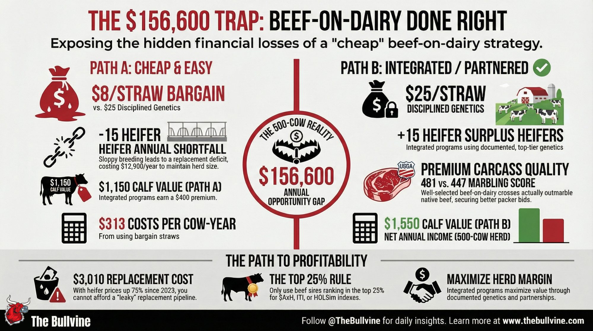 Executive Summary: The gap between a cheap beef-on-dairy strategy and a disciplined one on a 500-cow Holstein herd is $156,600 a year — $313 per cow. Most of that margin vanishes into places nobody budgets for: a 15-heifer annual replacement shortfall at $3,010 each, higher calf mortality, and undocumented calves discounted $25–50 a head at the barn. CoBank’s heifer deficit data says the industry is 600,000–700,000 head short; every $8 straw of unselected beef semen widens the hole on your farm while you think you’re pocketing $7,700 in annual savings. Peer-reviewed carcass research shows well-selected beef × dairy crosses actually outmarble native beef — but random-sire crosses are sliding toward Holstein bull calf pricing. Three paths, three cost structures, and a 30/90/365-day audit that starts with one number: your real 21-day PR — not your target. If your replacement pipeline can’t survive your current beef percentage, that $156,600 gap isn’t a model. It’s your margin.
