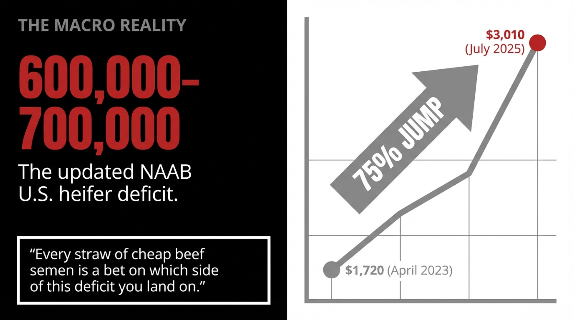 CoBank’s August 2025 analysis put a number on what a lot of producers already felt in their gut: the U.S. dairy industry was roughly 800,000 heifers short — a figure that updated NAAB year-end data released March 10, 2026, has since been revised closer to 600,000–700,000 head. The correction from sexed semen is running ahead of schedule. But the farm-gate math hasn’t softened, because replacement heifers tracked from $1,720 per head in April 2023 to $3,010 by July 2025 — a 75% jump in barely two years. And every straw of beef semen in your tank is a bet on which side of that deficit you land on.
