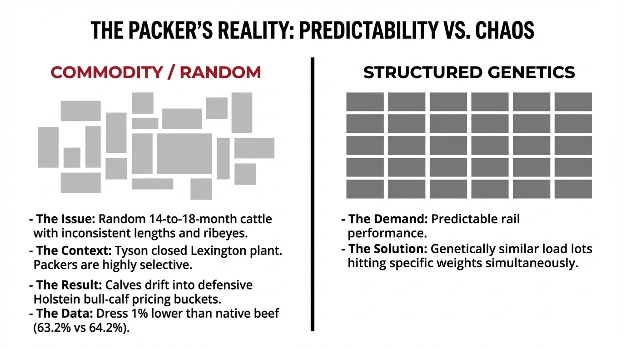 In November 2025, Tyson Foods announced the closure of its Lexington, Nebraska, beef plant — a facility processing about 5,000 head per day, roughly 4.8% of U.S. daily beef slaughter. With capacity coming offline and overall beef production contracting, packers can afford to be selective. They want “predictable rail performance”: load lots of genetically similar cattle that hit specific weights and grades at the same time.