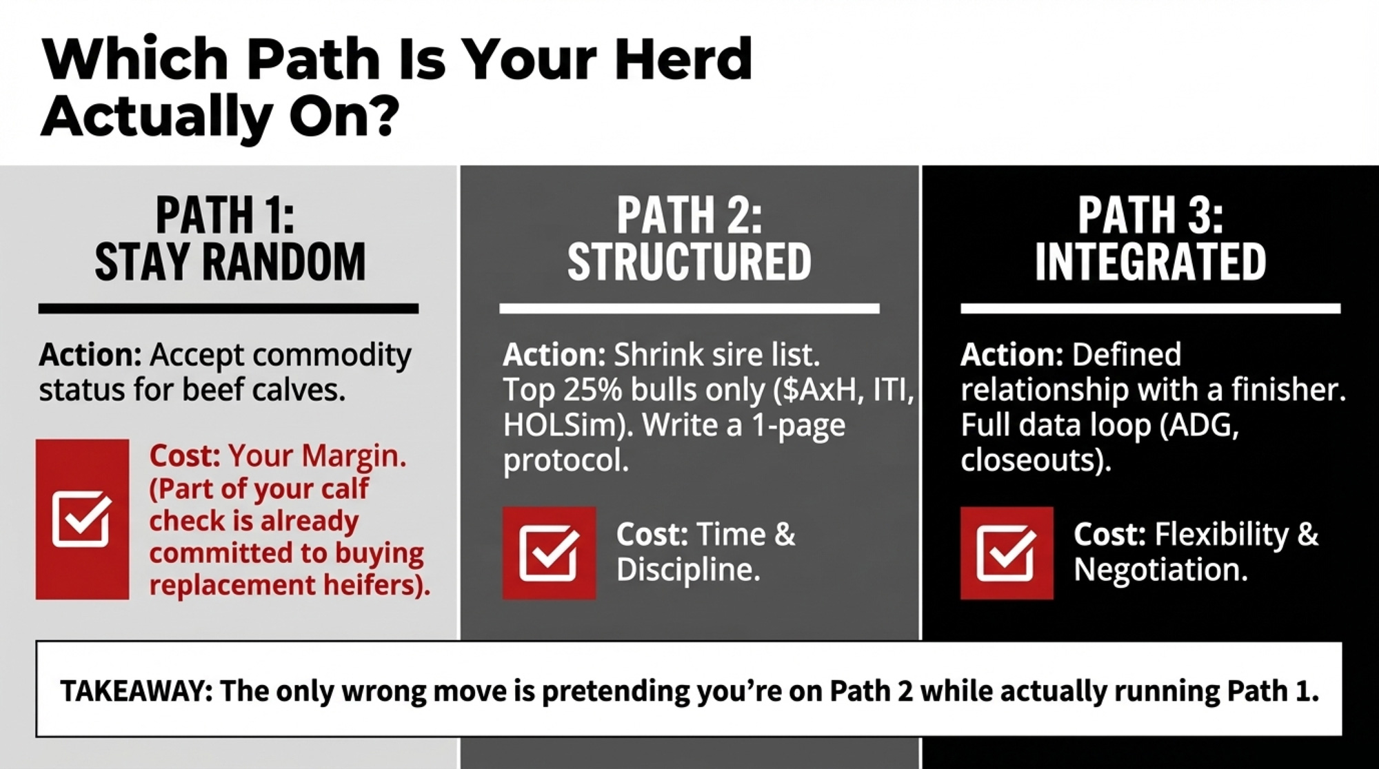 Path 1 — Stay Random, but Own the Trade-Off. You’re putting out bigger fires right now. Fine. Accept commodity status for your beef calves, and understand that part of your “good beef cheque” is already committed to future replacement purchases.
