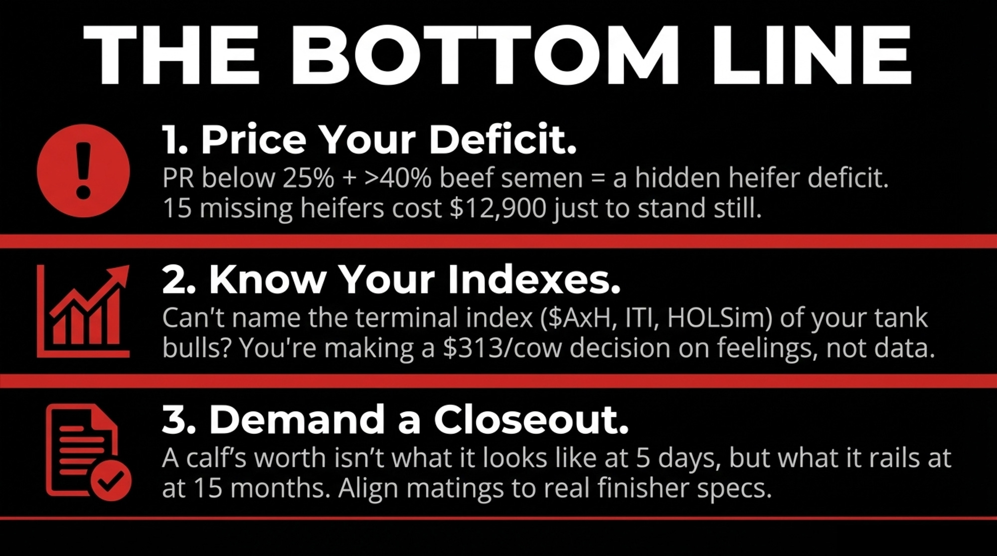 - If your 21-day PR is below 25% and you’re breeding more than 40% to beef, you’re likely already in a heifer deficit you haven’t priced. Run the replacement model before you reorder semen — at $3,010 per head, 15 missing heifers cost $12,900 a year to stand still.