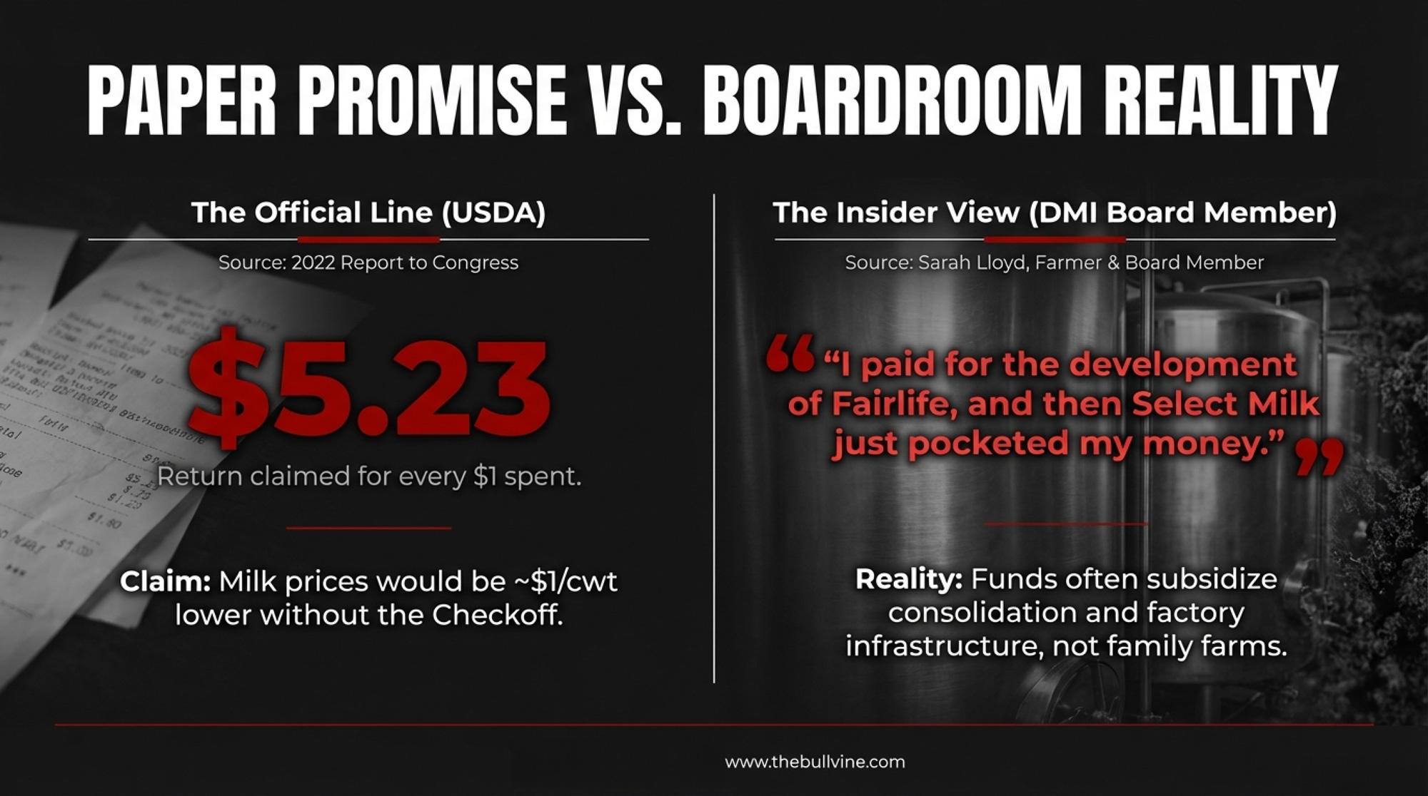 | Sarah Lloyd | Wisconsin Dells, WI 350 cows Nelson family operation | Co-op member Served on National Dairy Promotion Board & Wisconsin Milk Marketing Board | ~$9,500/year | “I paid for the development of Fairlife, then Select Milk just pocketed my money and took the profit when they sold to Coca-Cola.” (red) |