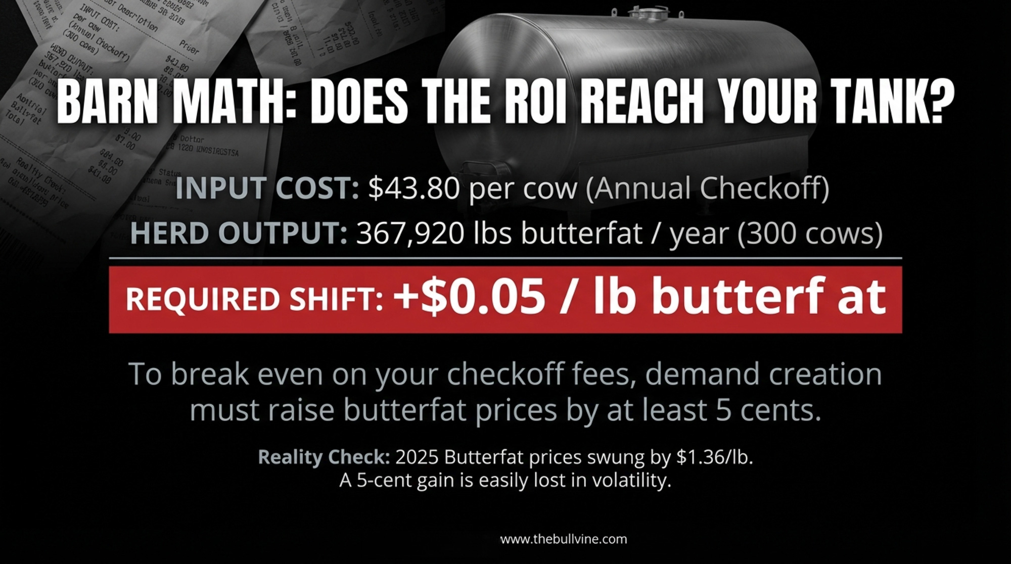 That same 300-cow herd produces roughly 367,920 lbs of butterfat per year. If checkoff-driven demand pushes the butterfat component price up just $0.05/lb above where it would otherwise land, that’s $18,396 — about $61 per cow. Your checkoff costs $43.80/cow. The math can work.
