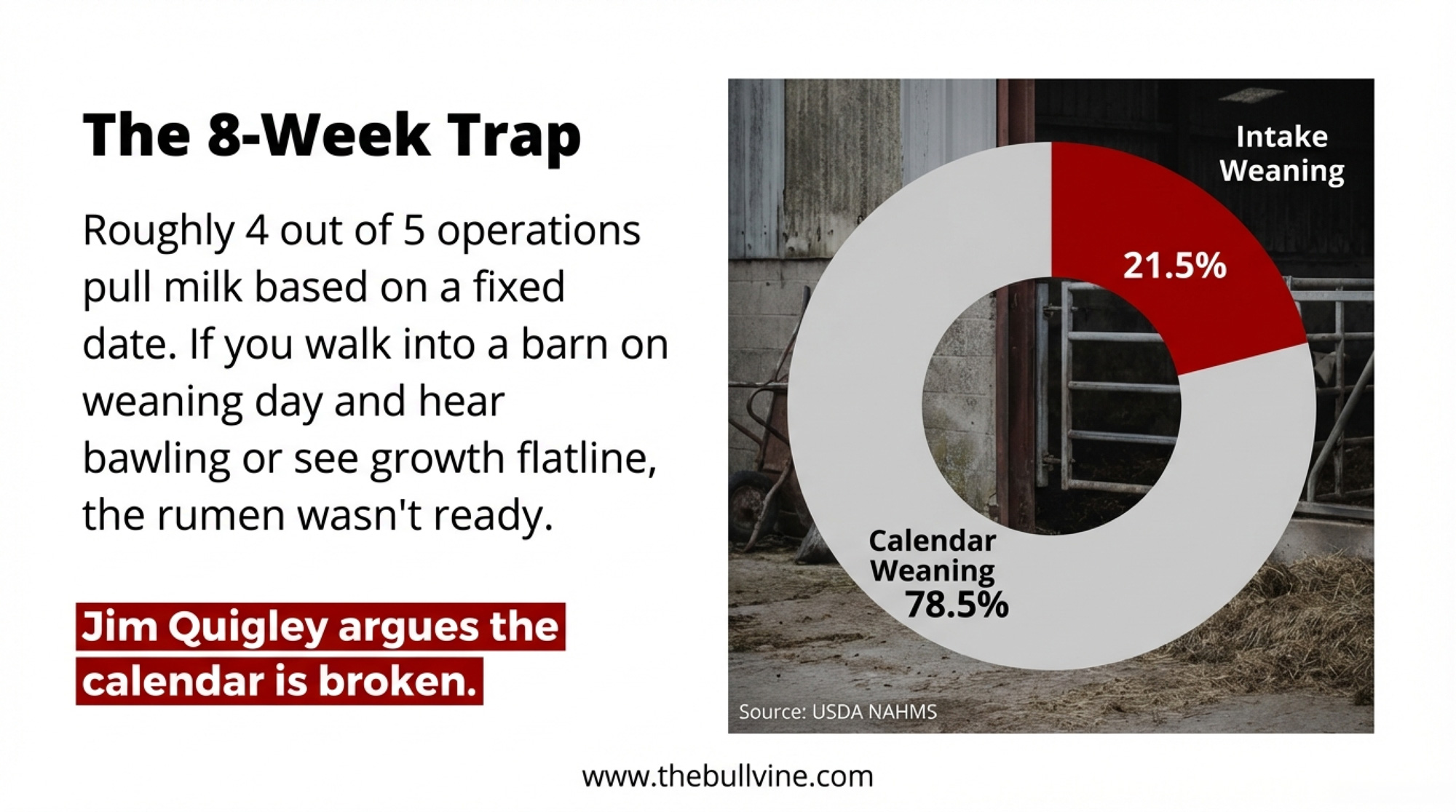 Only 21.5% of U.S. dairy farms wean calves based on starter intake rather than a fixed age. That’s the most recent national figure — USDA NAHMS Dairy 2014, now 12 years old and still the best we have. (The next NAHMS dairy study is anticipated in 2026, and anecdotal evidence suggests intake-based weaning has gained traction, but no national update exists yet.) What it means: roughly four out of five operations are pulling milk on a calendar. Jim Quigley thinks the calendar is broken.