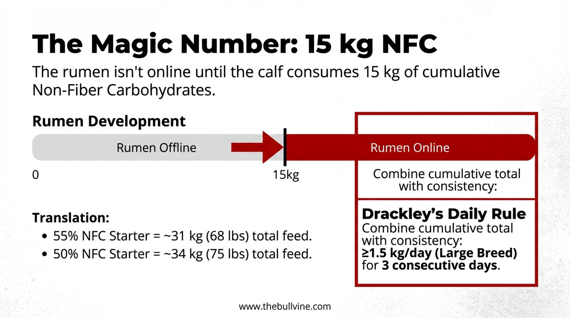 The calf nutrition researcher behind Calf Notes (calfnotes.com) has spent years arguing that weaning by intake is the only approach that lines up with what’s actually happening inside the rumen. His benchmark is specific: roughly 15 kg of cumulative non-fiber carbohydrates from the starter. That’s about 33 pounds. And on a lot of North American dairies running accelerated milk programs, his modeling suggests calves don’t cross that line until week 9 or 10.