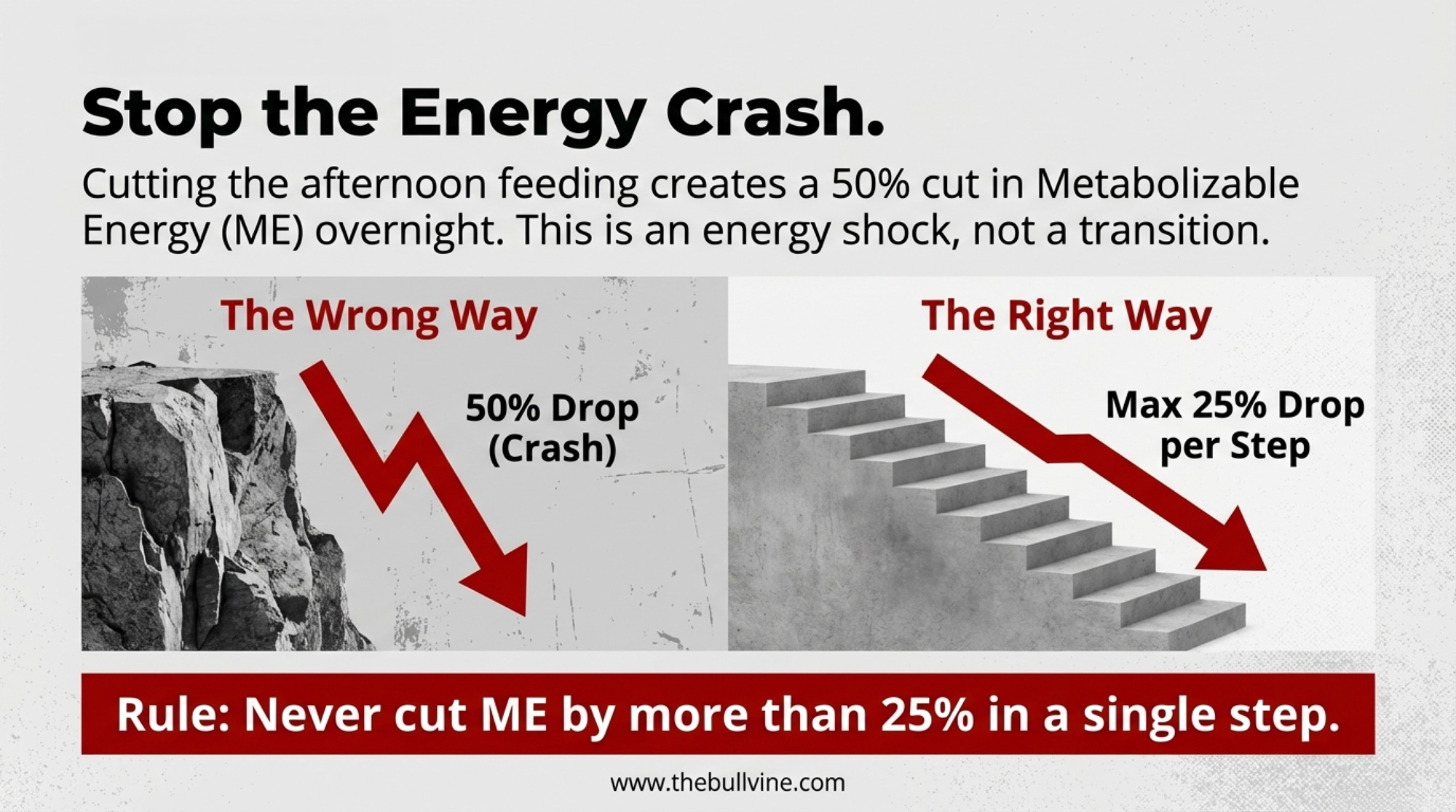 - Don’t cut ME by more than 25% at any single step-down. Dropping the afternoon feeding slashes ME intake by roughly 50% — that’s a maintenance-level energy shock, not a weaning transition. Taper gradually, like the cow’s own lactation curve would.