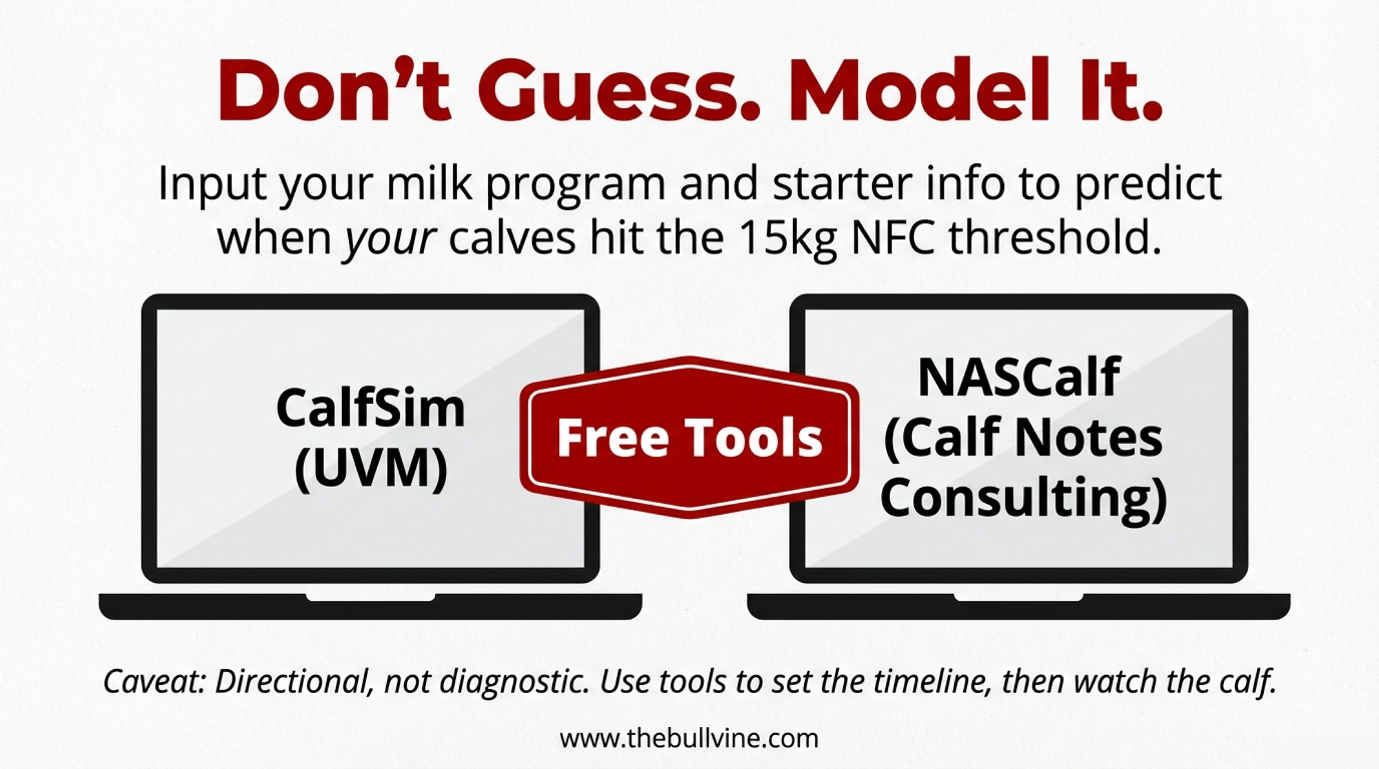 A word of honest caution on both tools — and Quigley himself is the first to say it: don’t overpromise and underdeliver. CalfSim and NASCalf are models. They predict average performance. Your individual calves will scatter around that average, and farm-specific curveballs — a scours outbreak, a cold snap, poor-ventilation stress, a high-pathogen housing environment — can throw off even the best prediction. Think of the output as directional, not diagnostic. It tells you roughly when your program should get calves to the NFC threshold. It doesn’t tell you that calf #47 in hutch row B is ready today.