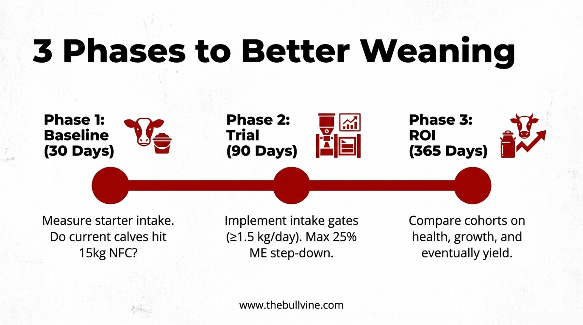 Phase 3 — 365-Day Comparison. Run two cohorts for a full year — one on your old calendar, one on intake-based weaning informed by CalfSim or NASCalf. Track growth to 6 months, age at breeding, treatment costs, and first-lactation milk as records come in. This is where you build your own ROI case and decide how much complexity your crew can realistically manage every day.