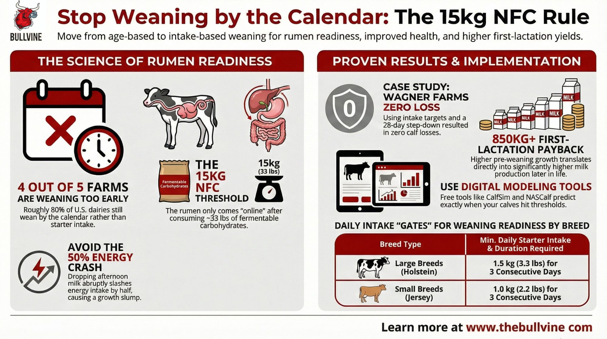 Executive Summary: Most dairies still wean calves by age, but Jim Quigley’s work shows the rumen isn’t truly ready until a calf has consumed about 15 kg of NFC from the starter — roughly 33 pounds of fermentable carbohydrate. Many 8‑week weaning programs, especially on higher milk intakes, never reach that mark, which helps explain the post‑weaning growth checks and treatment spikes producers see. Research from Quigley, NASEM 2021, and Jim Drackley’s 2025 weaning review all point in the same direction: later, intake‑based weaning with a gradual step‑down beats abrupt, calendar‑driven protocols on biological and performance outcomes. Wagner Farms in Wisconsin built their calf program around intake targets and a 28‑day weaning step‑down and recorded zero calf losses in the year. Free tools like CalfSim and NASCalf let you model when your own calves will reach the 15 kg NFC threshold and how different feeding plans affect intake, growth, and cost. The extra 7–14 days on milk might add $30–40 per calf, but the article walks through how smoother weaning, better growth, and higher first‑lactation yield can repay that investment — and gives a 30/90/365‑day plan to test it in your own calf barn.