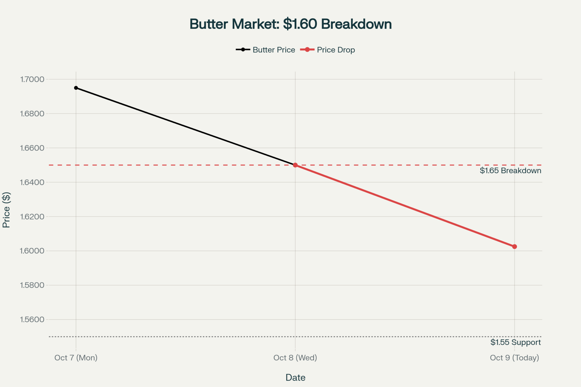 Examining the trend from the Daily Dairy Report data for October 9, what we’re seeing isn’t typical October volatility. With spot butter cratering to $1.6025 per pound (down from $1.6500 on Wednesday and $1.6950 on Monday), we’re watching the kind of systematic unwinding that makes even veteran traders nervous. Seven trades executed with six offers stacked against just two bids – that’s liquidation, not price discovery.