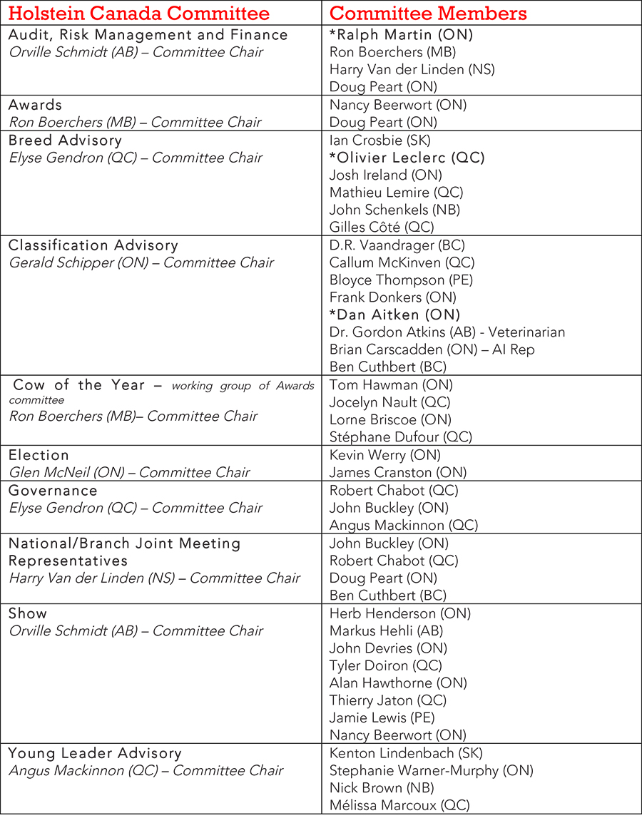 Holstein Canada thanks all committee members for their time, effort and dedication to the Association. The committees are an important part in ensuring the Holstein Canada Board of Directors receives feedback and suggestions from the membership. Ideas, comments and suggestions from all Holstein Canada members are always welcomed by committee members.