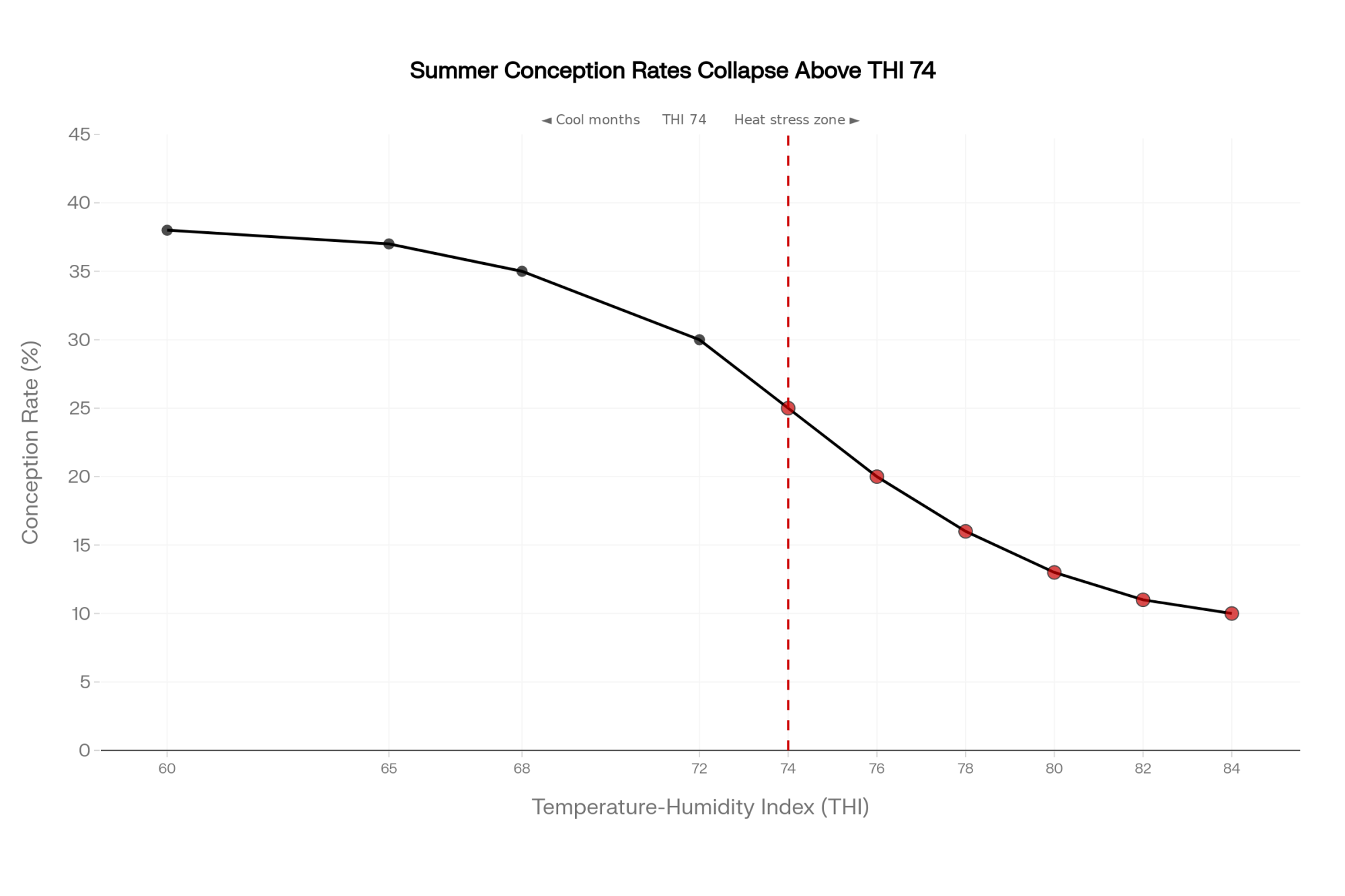 Heat‑stressed breeding seasons are a fertility tax. Peer‑reviewed field work and reviews show summer pregnancy rates routinely dropping from roughly 32–40% in cooler months down to 10–20% in severe heat, depending on region and THI. That’s not just semen baking in a hot AI kit. It’s inflammation, oxidative stress, and early embryos that never stand a chance. If you want to dig deeper into how those THI lines move conception rates, we’ve walked through it before.