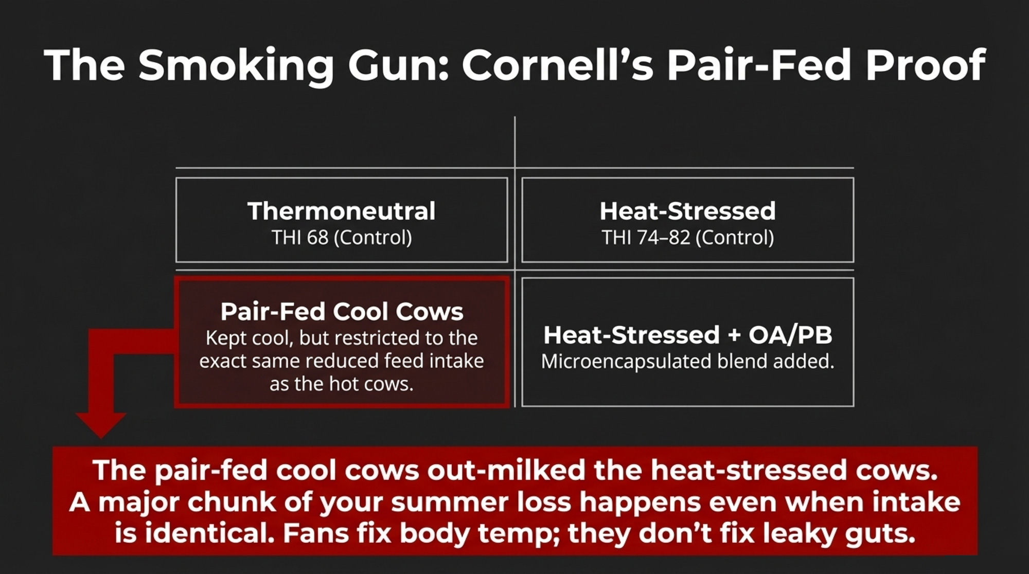That pair‑fed pen is the smoking gun. Same reduced intake as the hot group, but kept cool — and they still out‑milked the heat‑stressed cows. In other words, a chunk of your summer loss is happening independent of dry matter intake. Fans and sprinklers fix body temperature. They don’t fix a leaky gut.