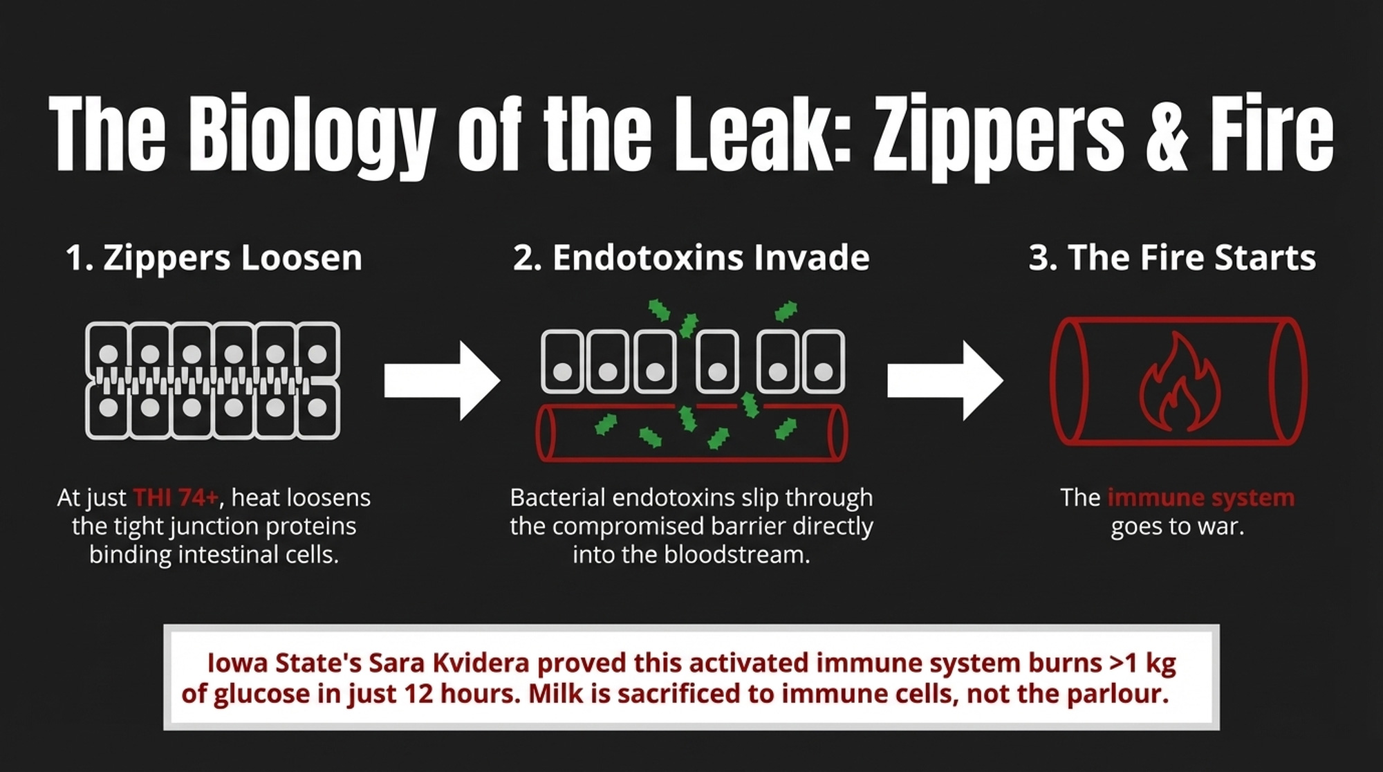 What’s actually happening? Heat stress loosens the tight junction proteins that zip intestinal cells together. Bacterial endotoxins slip through, hit immune receptors, and your cow’s immune system goes to war. Iowa State’s Sara Kvidera showed an acutely activated immune system in a lactating Holstein that burns more than 1 kg of glucose in just 12 hours. That’s several kilograms of milk sacrificed to immune cells instead of the parlour.