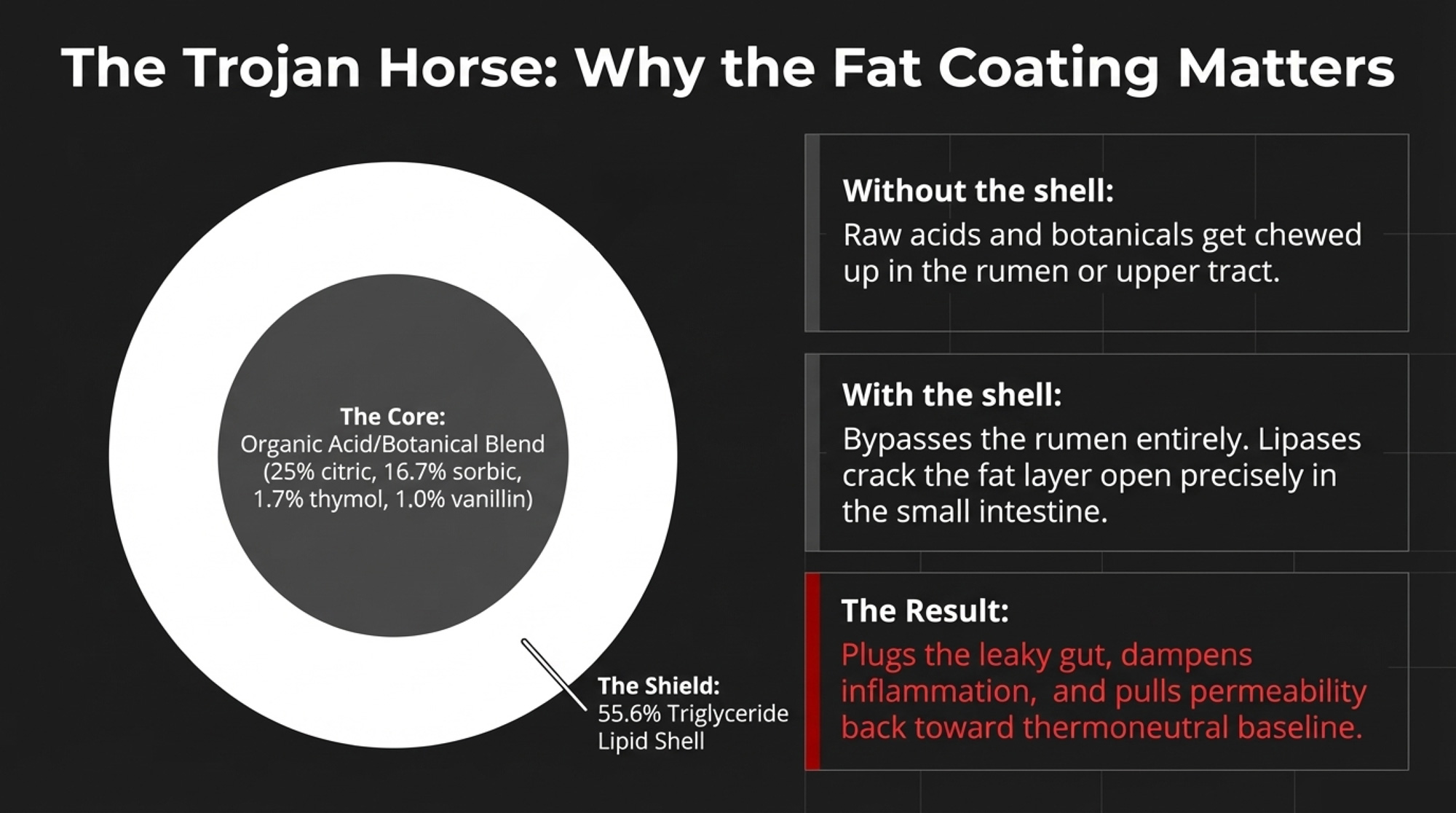 The cows got it twice daily as a top‑dress; controls got the same amount of plain triglyceride carrier, so every pen was handled the same way. That triglyceride coating is the whole play. In vitro work showed minimal release in rumen‑like fluid and targeted release under intestinal conditions once lipases crack the fat layer open. Without that fat shell, most organic acids and botanicals get chewed up or absorbed upstream before they ever see the small intestine.