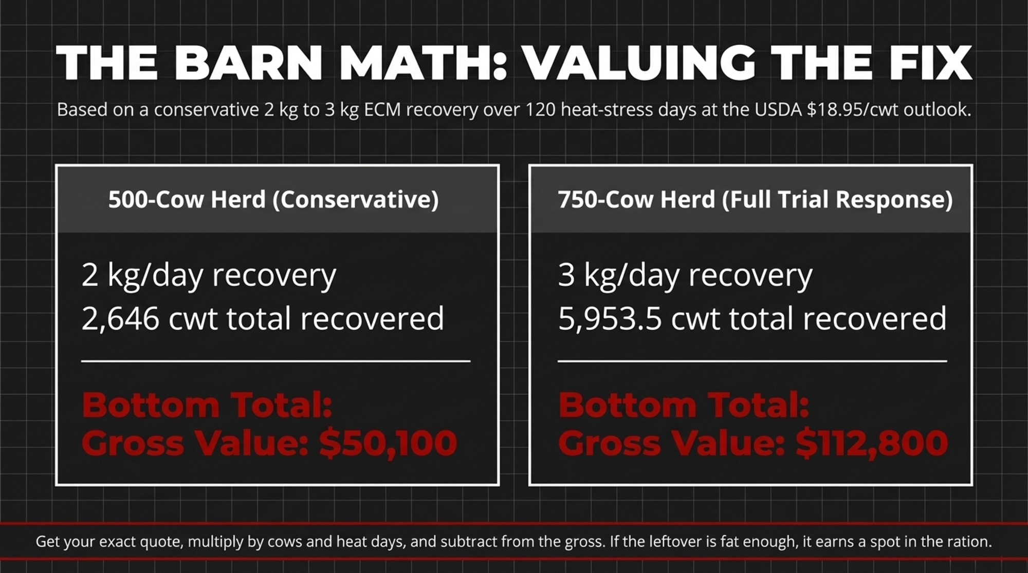 - At $18.95/cwt, a 2 kg ECM/cow/day recovery on 500 cows over 120 heat‑stress days is worth roughly $50,100 in gross milk value. Your net depends on product cost and the real response on your farm — not on anyone’s slide deck.