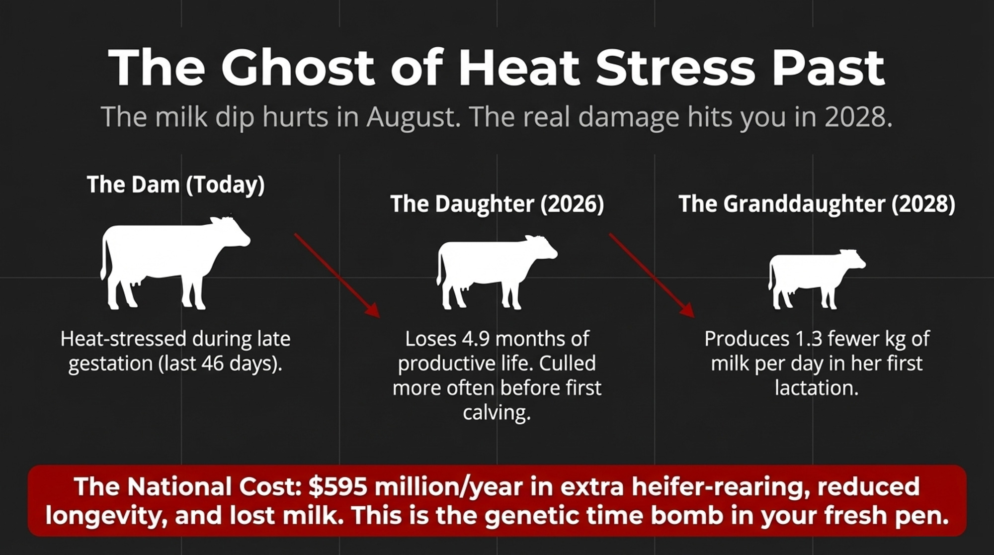The same paper reported granddaughters of heat‑stressed dams produced 1.3 fewer kg of milk per day in their first lactation than granddaughters of cooled dams. A University of Florida IFAS factsheet estimated that, on a national basis, late‑gestation heat stress in dairy cows costs about $595 million/year once extra heifer‑rearing, reduced longevity, and lost milk yield are added together.