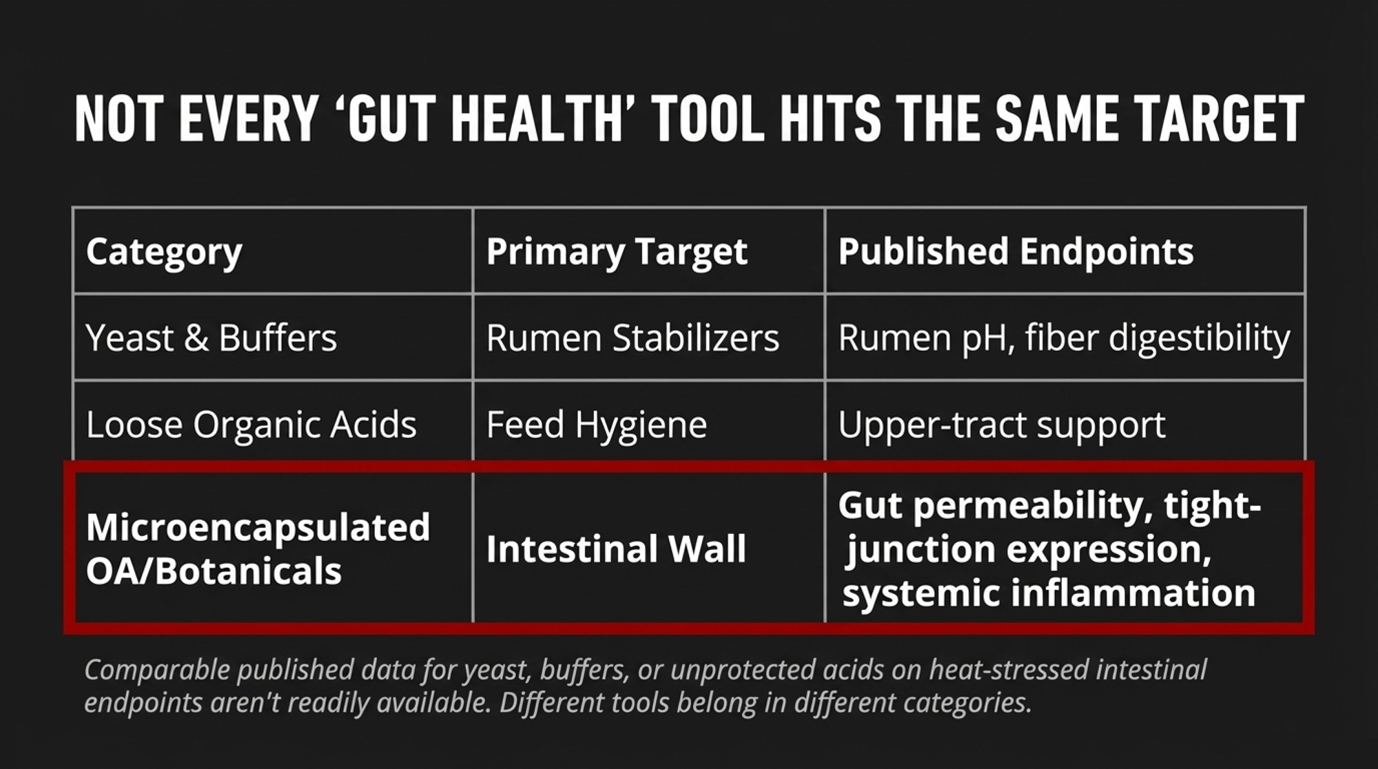 A lot of products sold under the “gut health” banner actually have their best published data in the rumen — pH stabilization, fibre digestibility, and components. That work has value. It’s just a different job than sealing an intestinal wall under heat stress.