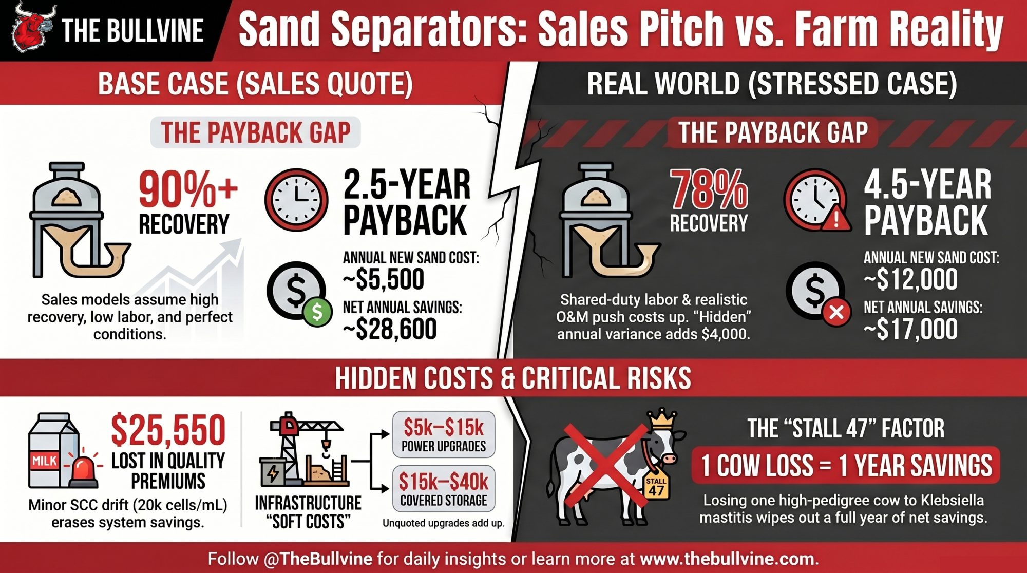 McLanahan engineered the SMS12 for dairies with 500 or fewer cows. Using the company’s own published 500-cow example — 50 lbs of sand per cow per day, $12/ton delivered, electricity at $0.07/kWhr — the pre-separator sand bill runs $54,750, and the system claims to cut roughly $40,000 a year off that bill while recovering more than 90% of the bedding. Base-case projections are standard practice across dairy capital equipment, from robotic milkers to heat recovery. The question isn’t whether the base case is optimistic. It’s how it holds up against your barn, your labor, and the cow in stall 47.