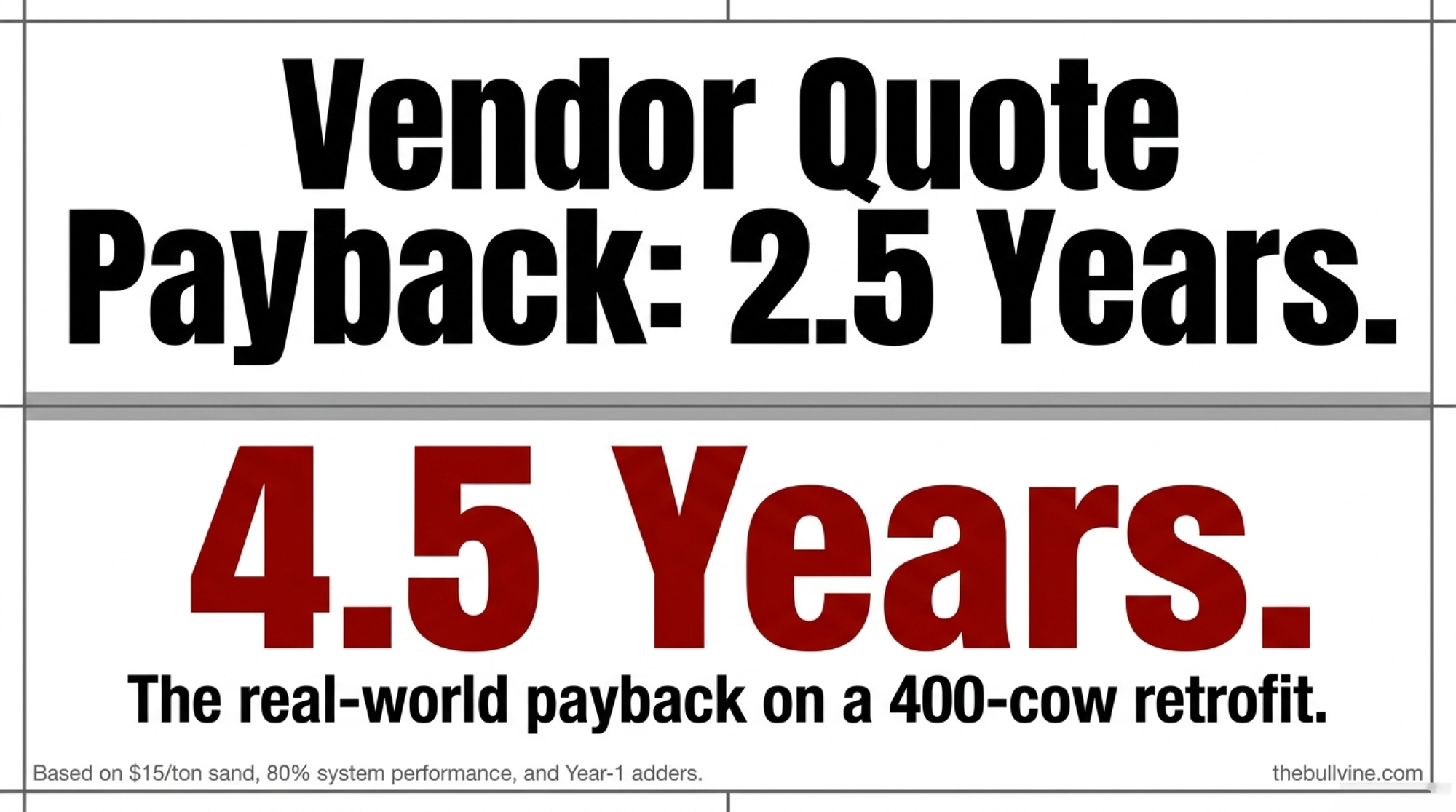 Run the design-spec math honestly. Makeup sand at 10% of 3,650 tons ($5,475), O&M at $15,000, and straight-line depreciation on $85,000 of capital over 15 years ($5,667/yr) totals about $26,000 all-in. That’s $65/cow. Gross cash savings against the all-new baseline — new sand avoided minus O&M — come to $34,275. That’s the number the dealer spreadsheet divides into $85,000 to get its 2.5-year payback. Put depreciation back into the denominator, and simple payback stretches to roughly 3 years even at design spec. Add interest on the loan ($3,000–$5,000/year, depending on term), and the headline number softens more.