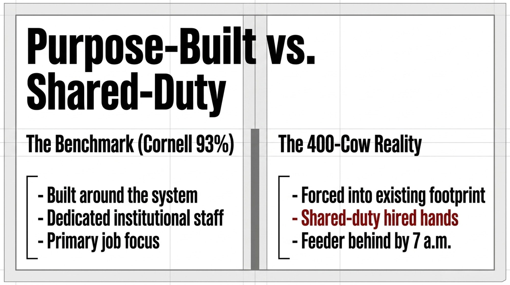 Both systems work, but for different reasons. Cornell’s works because it was purpose-designed. SwissLane’s works because the Oesches have the scale and internal infrastructure to run it properly. That variable is missing from the base-case model — and it’s exactly the variable a 400-cow retrofit is most exposed to.