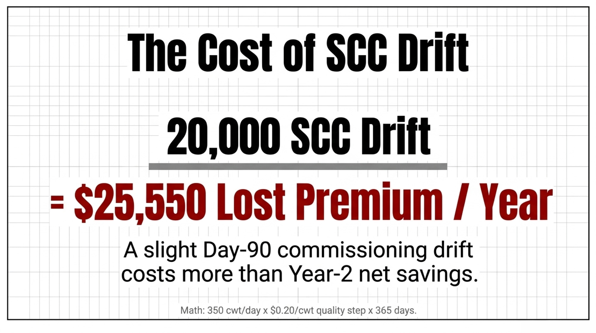 That’s $25,550 of premium lost, every year the drift persists — against a stressed-case net savings of roughly $17,000. The lost premium alone is larger than the Year-2 net savings. It doesn’t just stretch the payback period. It inverts it.