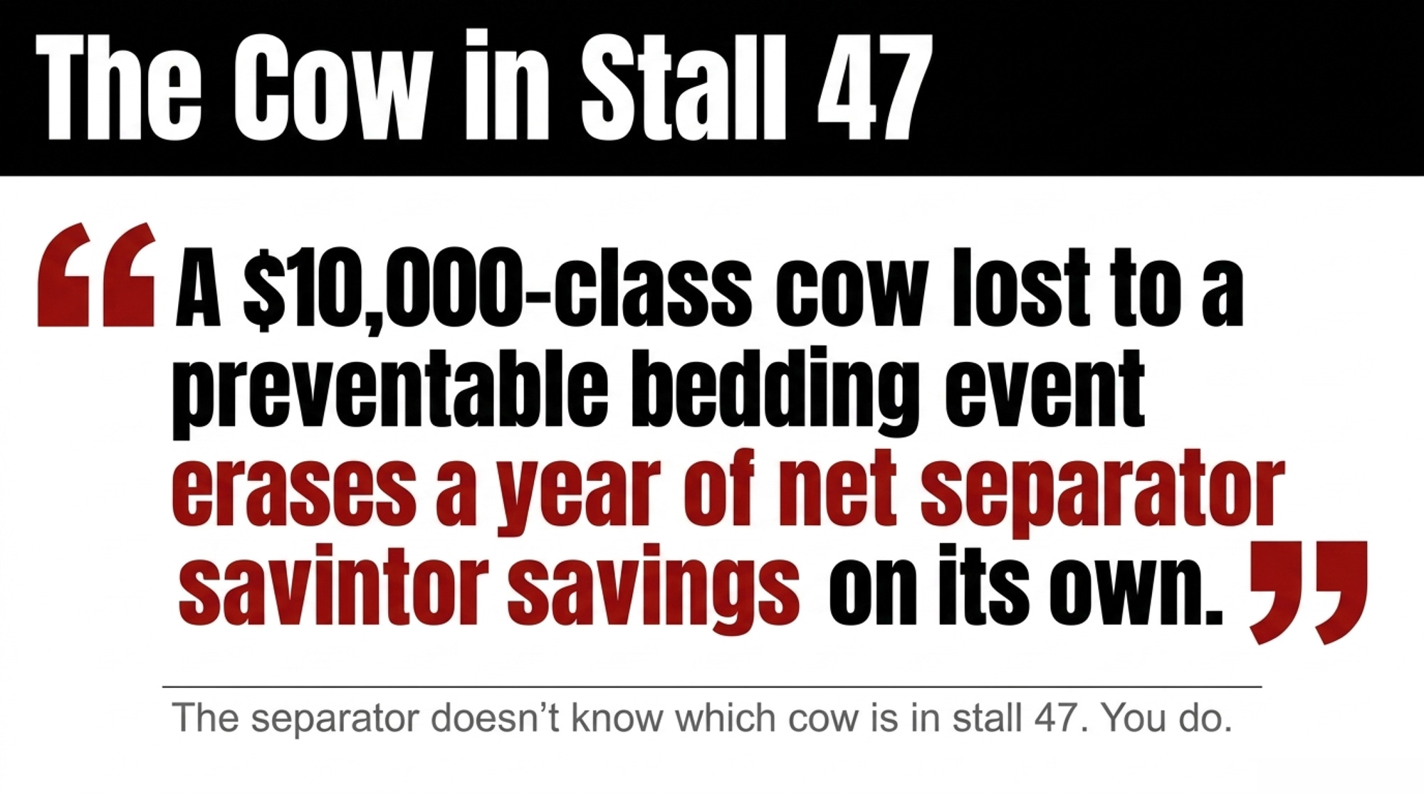 On a 400-cow herd carrying even a small nucleus of breeder-value animals, the 4.5-year payback math flips the moment one of those cows goes down in Month 3. A $10,000-class cow lost to a preventable bedding event erases a year of net separator savings on its own — before you count what her daughters were supposed to contribute. The separator doesn’t know which cow is in stall 47. You do.
