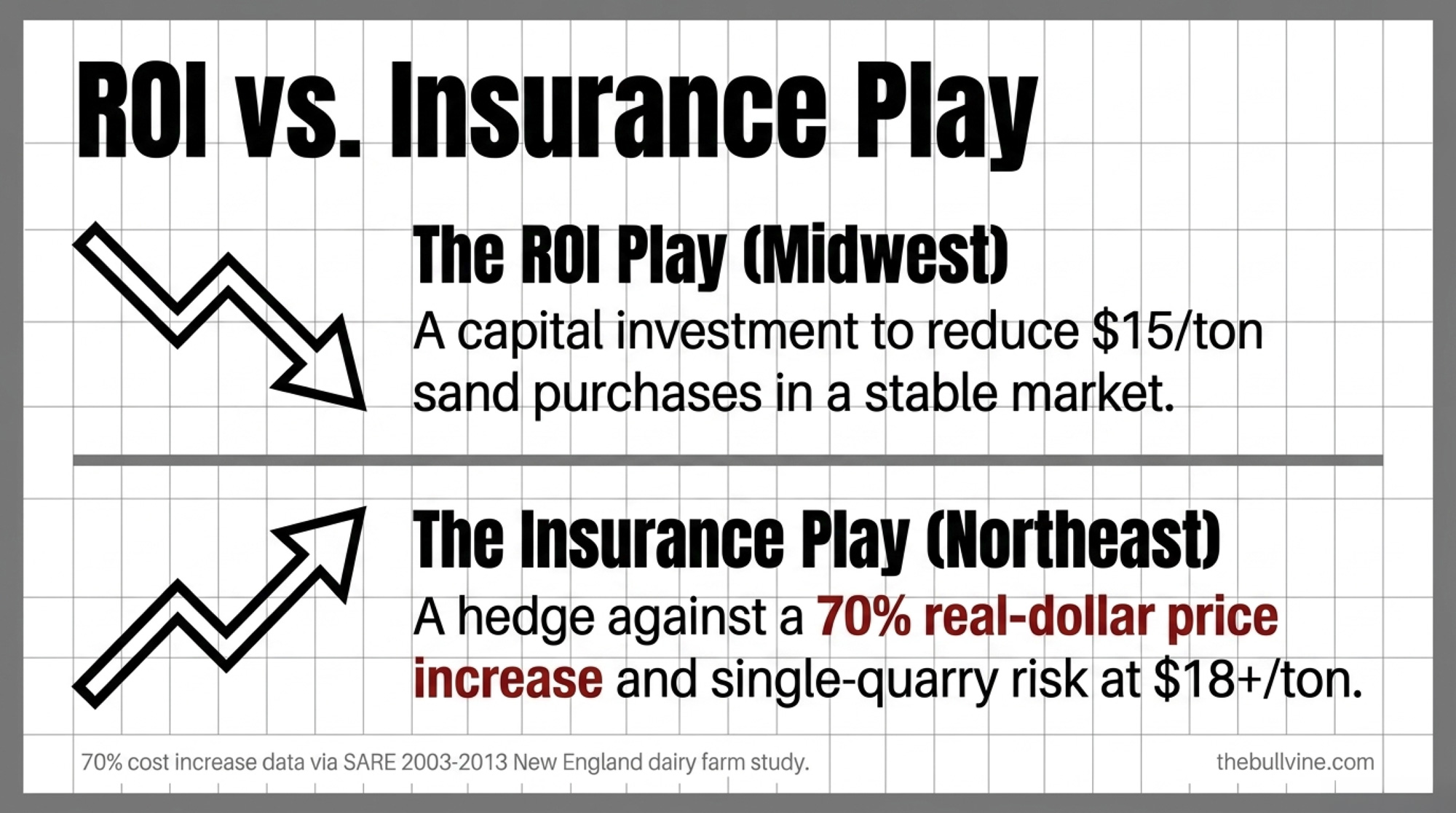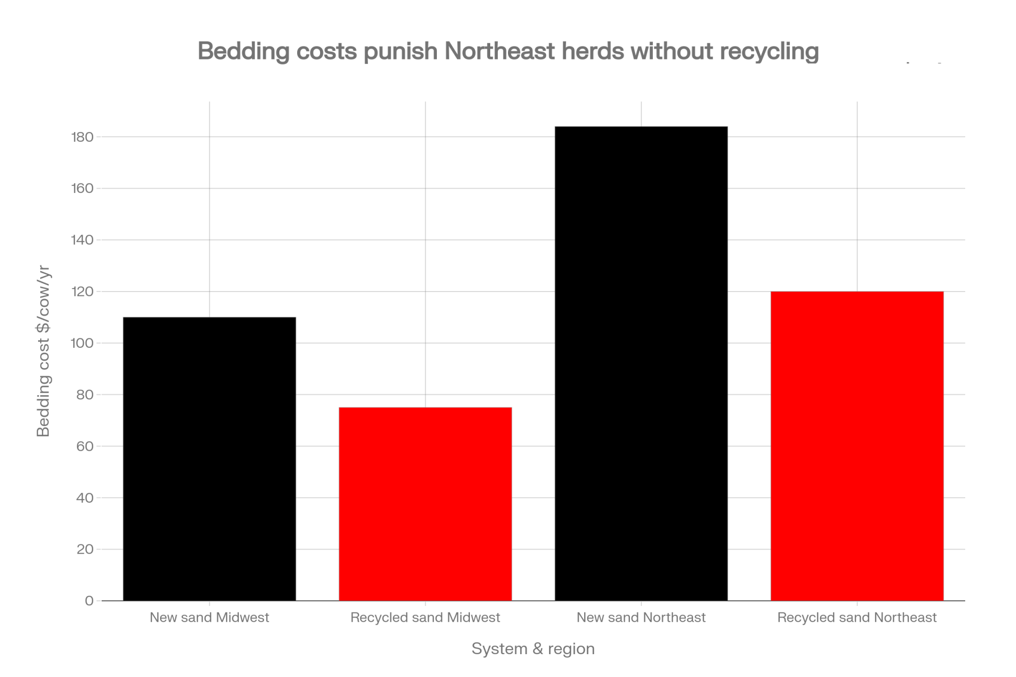 The 2017 SARE-funded bedding study by Smith, Simms, and Aber (“Case Study: Animal bedding cost and somatic cell count across New England dairy farms”) surveyed 129 producers and documented a 70% real-dollar increase in bedding costs between 2003 and 2013 — conventional dairy costs rose from $85/cow/year to $184/cow/year, and organic operations from $67 to $145. That trajectory hasn’t reversed. Quarry consolidation, construction demand, and 30×50 silica sand specifications keep pinching supply.