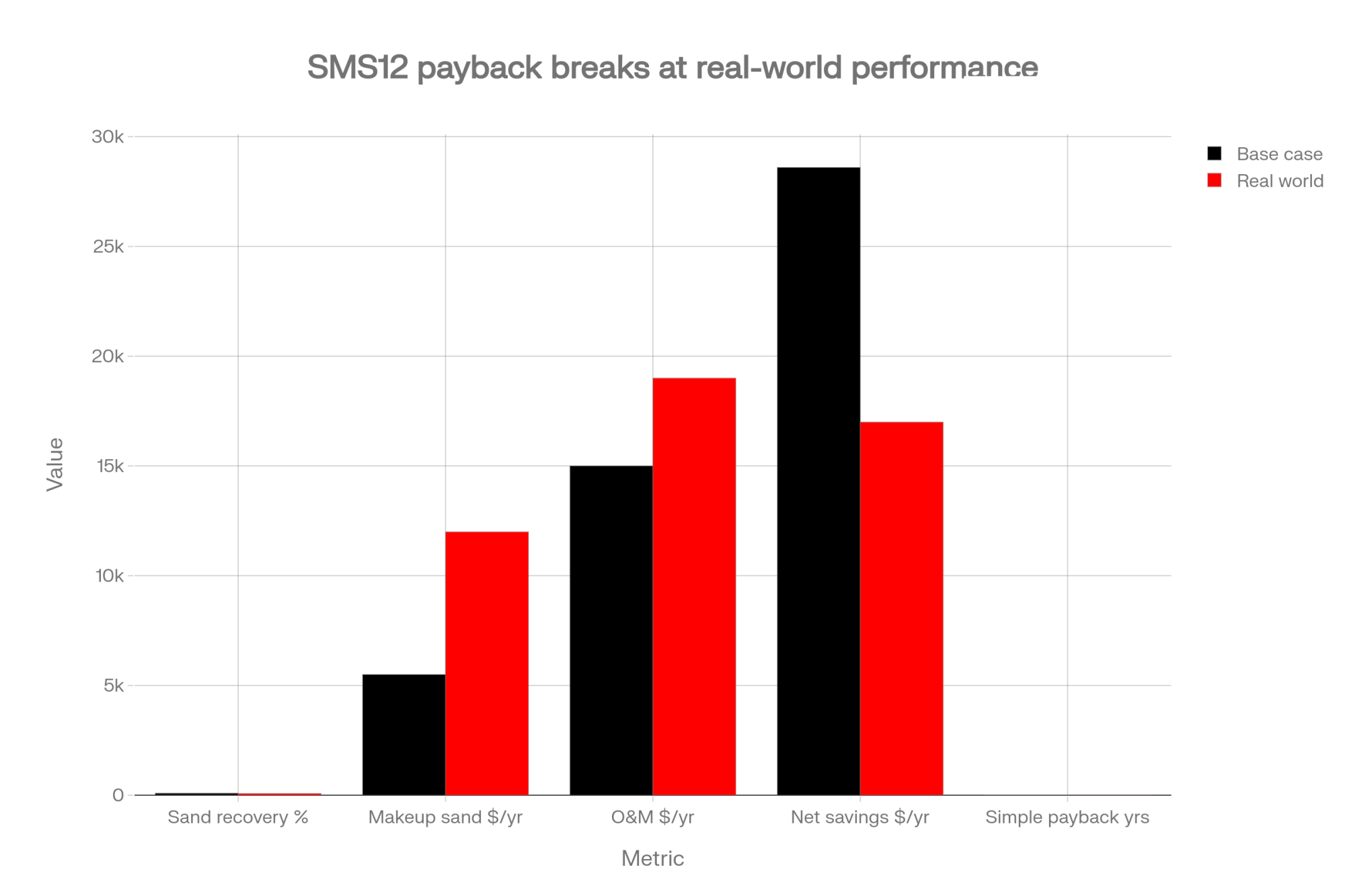 Now haircut it. Recovery drifts from 90% to 78%. Makeup sand climbs toward 22% of pre-separator volume — about $12,000. O&M runs $4,000 over projection, a routine Year-1 variance on any new dairy capital equipment. Tack on one Year-1 commissioning SCC event ($3,000–$5,000) and one mid-range mechanical intervention ($7,500), amortized into Year 1 rather than buried. Net savings compress to roughly $17,000. Simple payback stretches to roughly 4.5 years. Still positive. Just no longer a runaway case.