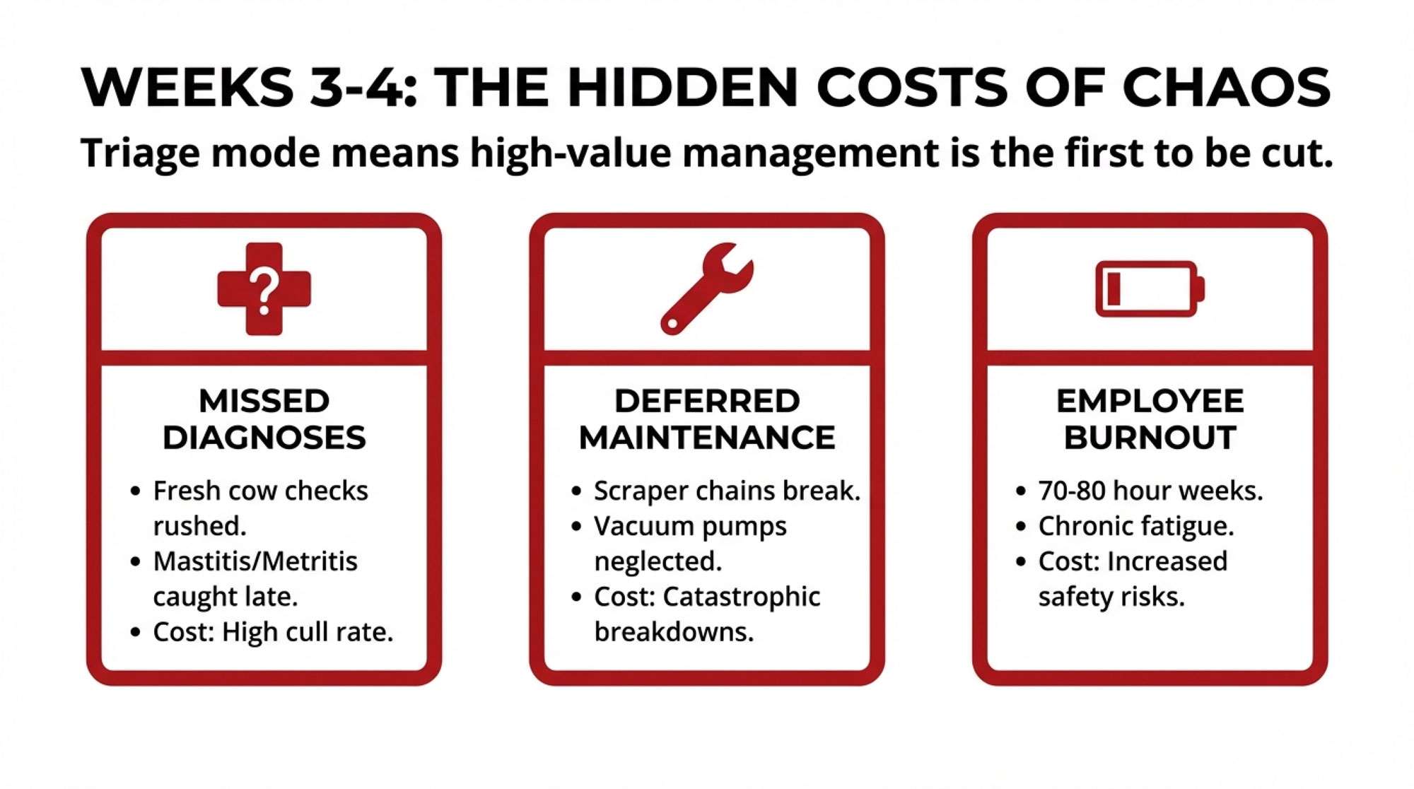 - Maintenance that should be preventative becomes “we’ll get to it.” A scraper chain slapping in the gutter or a vacuum pump sounding a little off isn’t nothing. Farm management case studies from extension programs are full of stories where small maintenance jobs turned into big, expensive breakdowns because nobody had time to deal with them when they were still small.