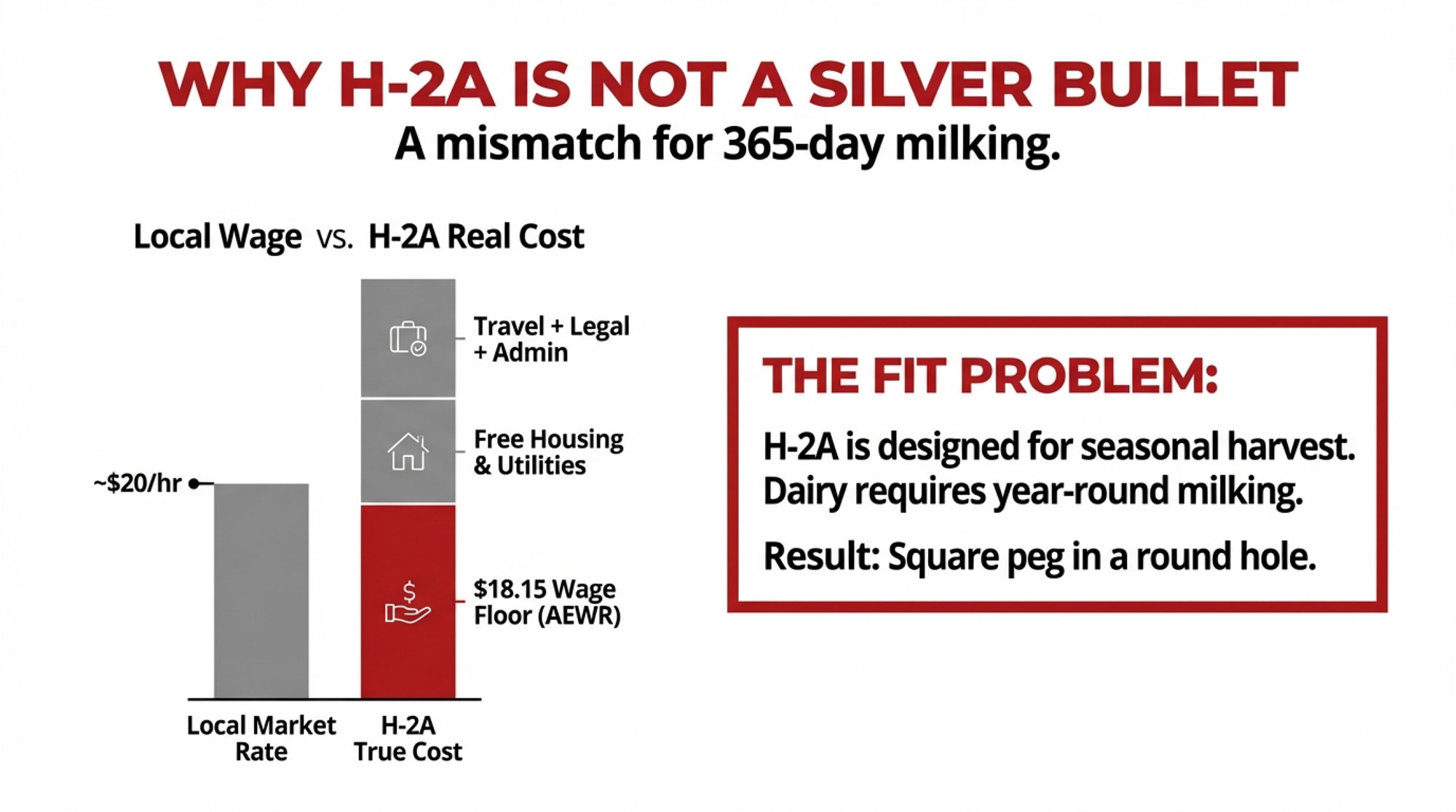 - H‑2A helps, but doesn’t fix the parlor: The visa fits seasonal crop work, not year‑round milking; real costs run well above the $18.15/hr AEWR once housing, travel, and compliance are included.