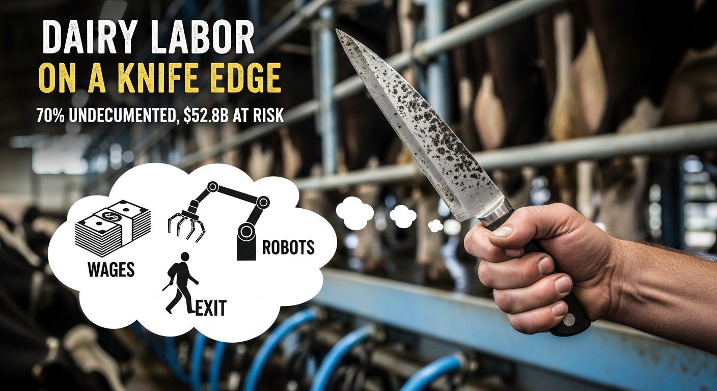 Executive Summary: Wisconsin dairy is riding a knife-edge of labor. A UW–Madison School for Workers survey estimates more than 10,000 undocumented workers now perform about 70% of the state’s dairy labor, while a Texas A&M/NMPF study shows immigrant workers make up 51% of all hired U.S. dairy labor and produce 79% of the nation’s milk, with their loss projected to close over 7,000 farms, cut 48.4 billion pounds of milk, and nearly double retail prices. At the same time, updated UW–Madison/DATCP figures show dairy is generating $ 52.8 billion a year and 120,700 jobs in Wisconsin, so any shock to that workforce hits the entire rural economy. Against that backdrop, this article walks through a 500‑cow, 30‑day “labor shock” in which 40% of the crew disappears, showing, in barn‑level detail, how milking schedules drift, fresh cow management and transition‑period care get squeezed, butterfat performance slides, and fatigue and overtime chew into already thin margins. From there, it lays out the two main survival paths herds are actually using—paying higher wages and building stronger people systems to keep a more legal, stable crew, or investing in automation, especially robotic milking, to permanently cut labor hours per hundredweight—while giving H‑2A a fair, honest look as a partial tool rather than a fix‑all. It also explains how those choices ripple through processors, co‑ops, and local businesses, and how lenders are increasingly favoring farms that treat labor as a strategic risk rather than a background headache. Most importantly, it closes with a concrete, kitchen‑table playbook of questions and scenarios you can use to map your own labor exposure, run the math on wages versus robots, talk with your lender and family, and decide whether your farm’s future is as a top‑tier employer, a tech adopter, a niche player, or an operation that plans its exit on its own terms.