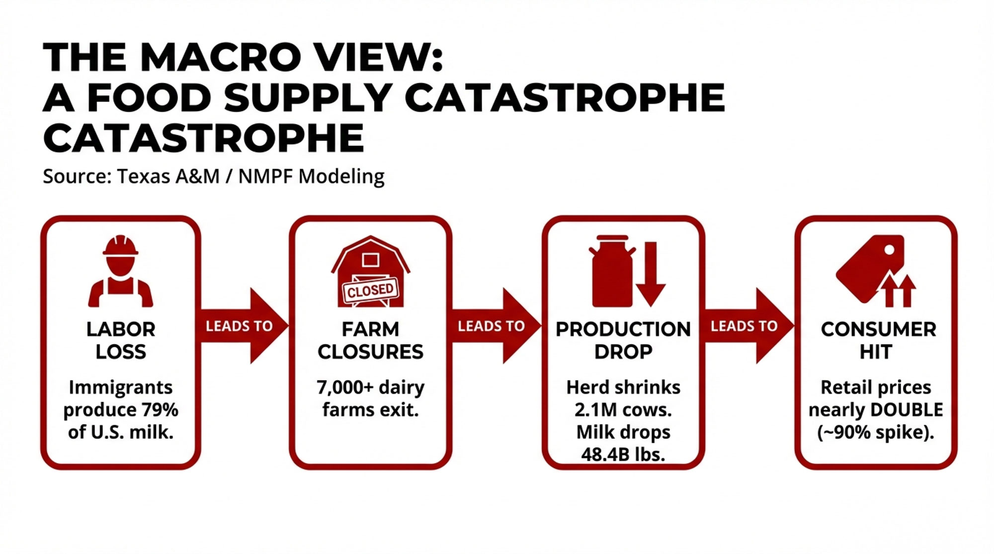 - National stakes are massive: Texas A&M/NMPF data shows immigrant workers make up 51% of hired U.S. dairy labor and produce 79% of milk; losing them would close 7,000+ farms, cut 48.4 billion pounds of production, and nearly double retail prices.